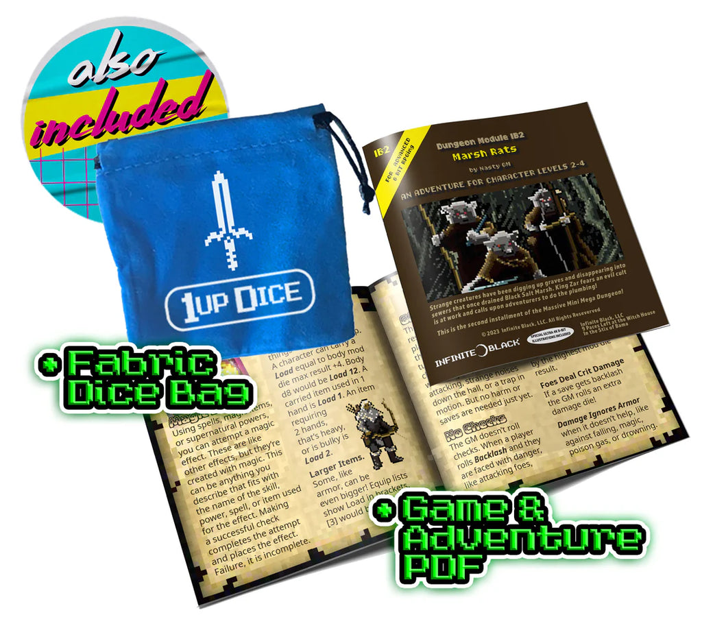 Additionally included are a fabric pouch, a digital 8-bit rulebook, and an exclusive adventure PDF specifically tailored to this set.
