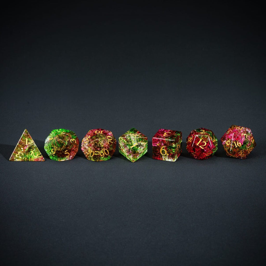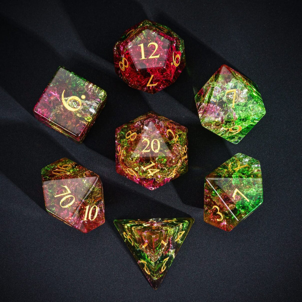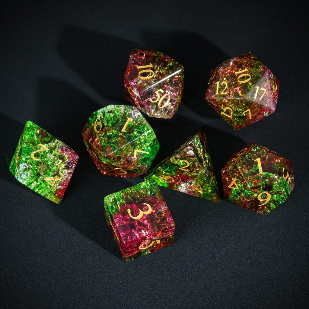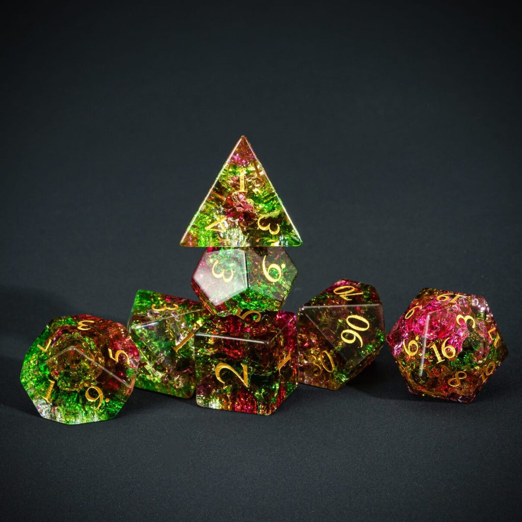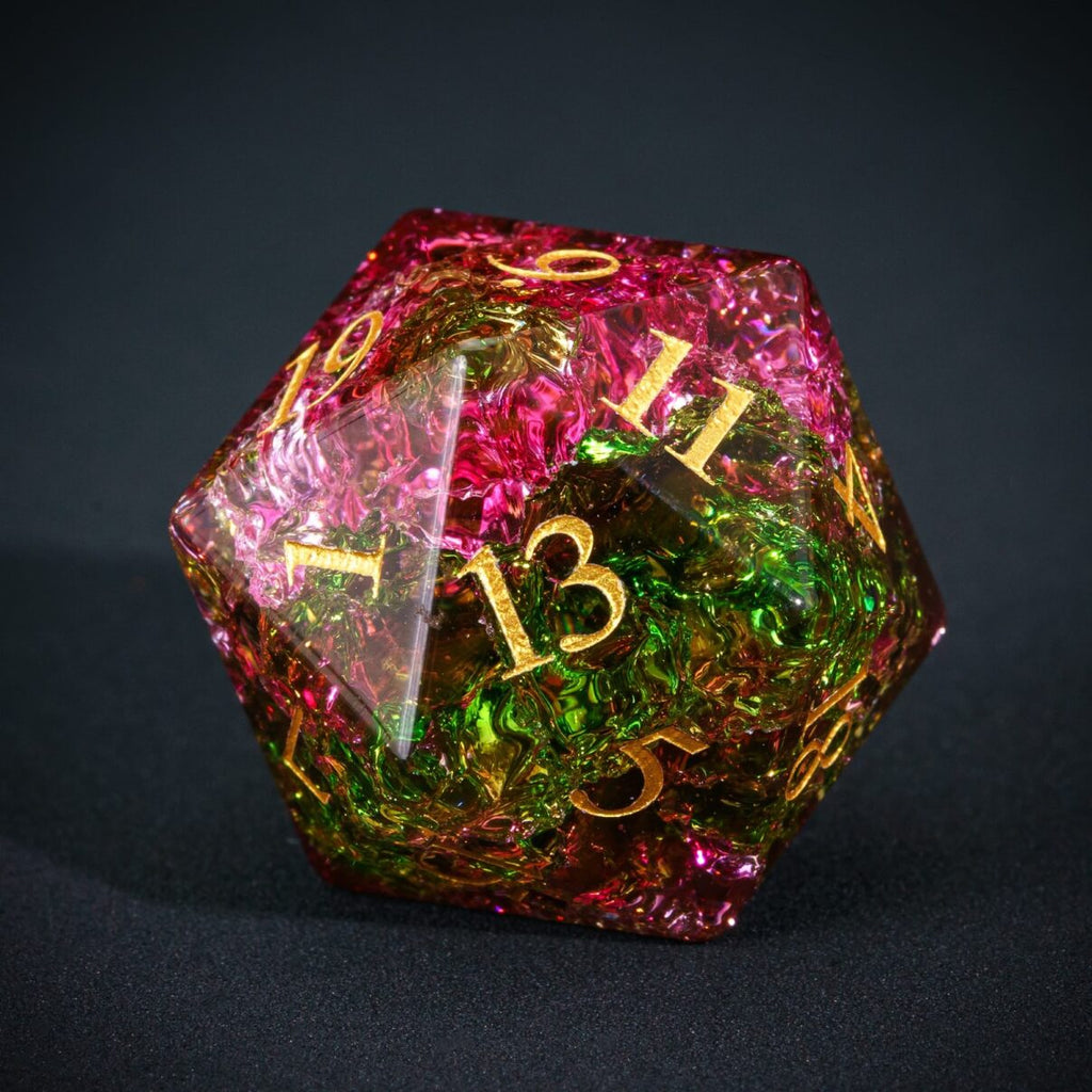 From the shards of this explosion emerged the Bloom Splitter – Dice of sparkling glass, filled with the untamed pulse of life itself.