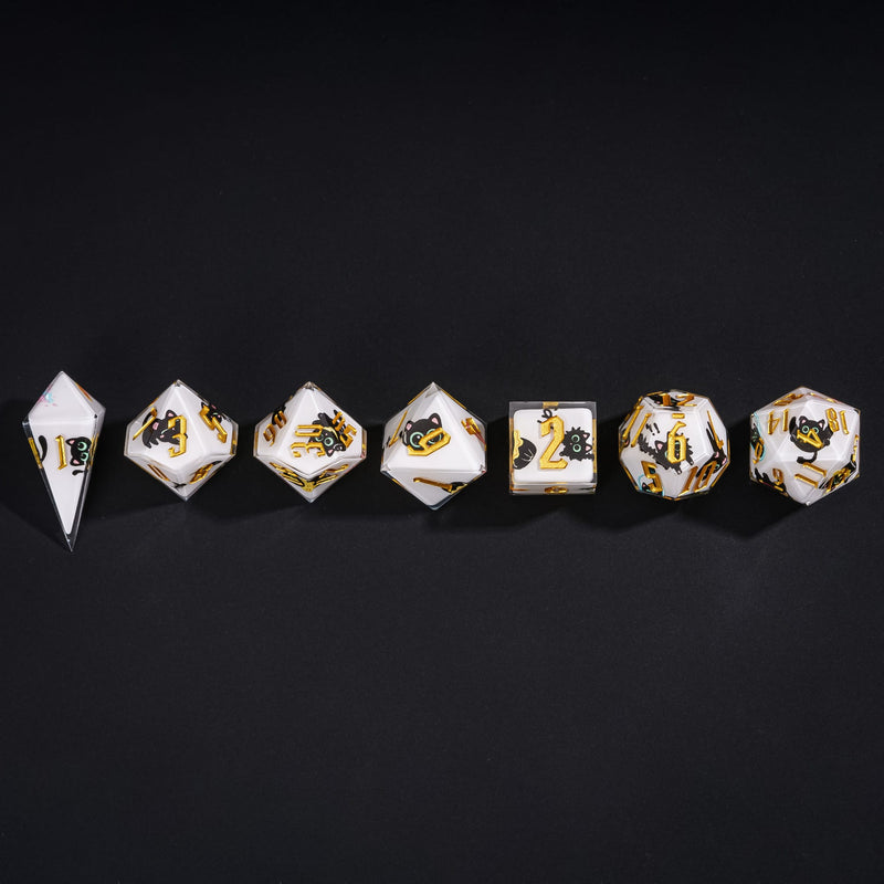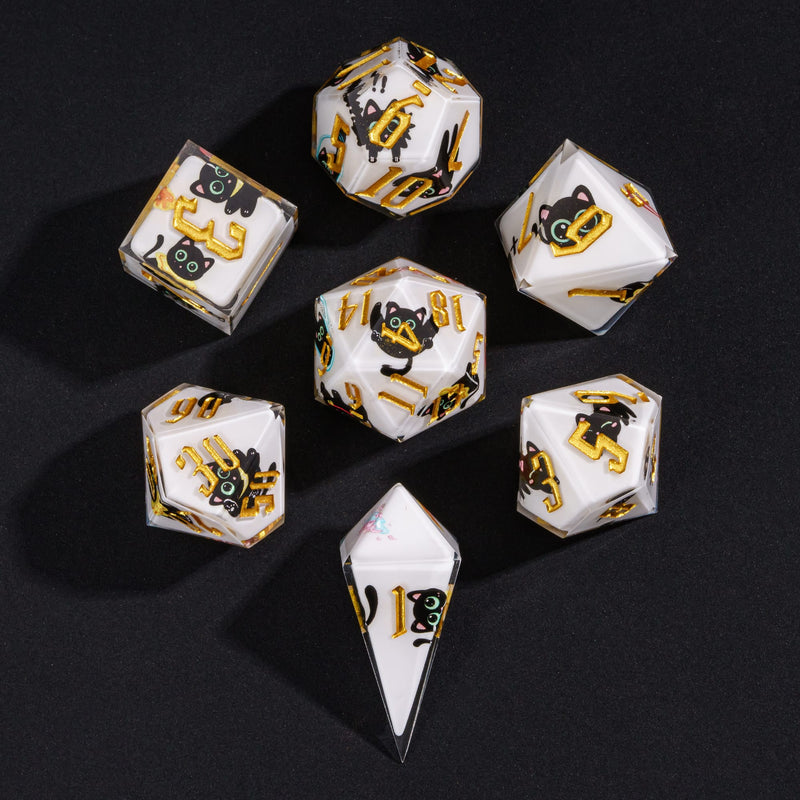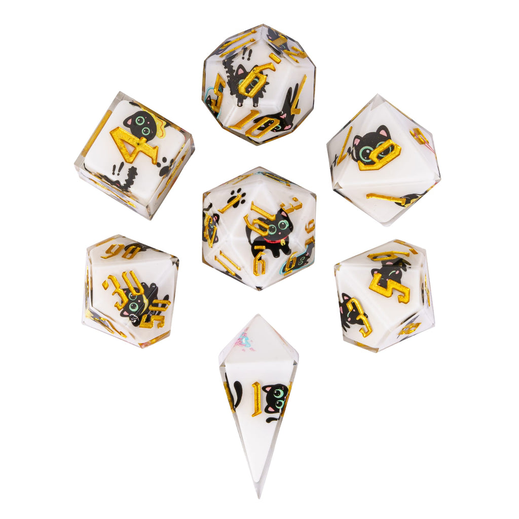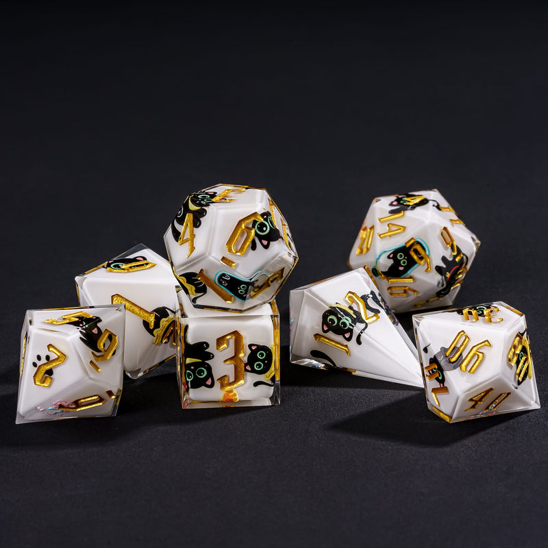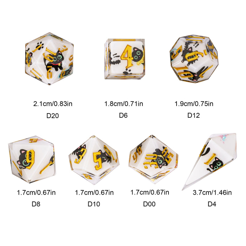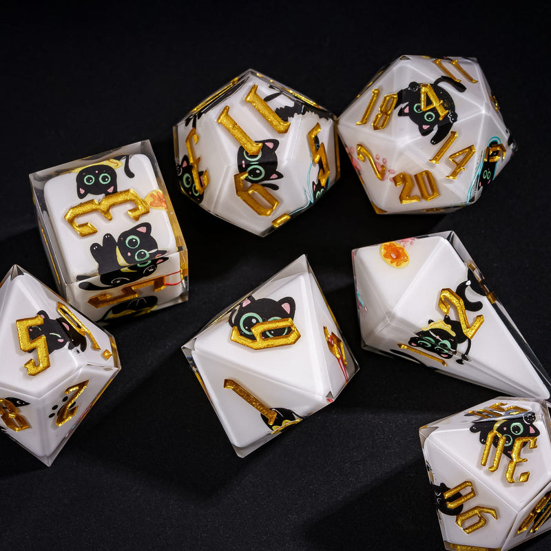 Discover the magic and playfulness of Cat's Whims, the exclusive resin dice set for role-players and cat lovers. Each side of these lovingly designed role-playing dice Dice shows a different emotion of small cats: curious, playful, startled, or dreamy.