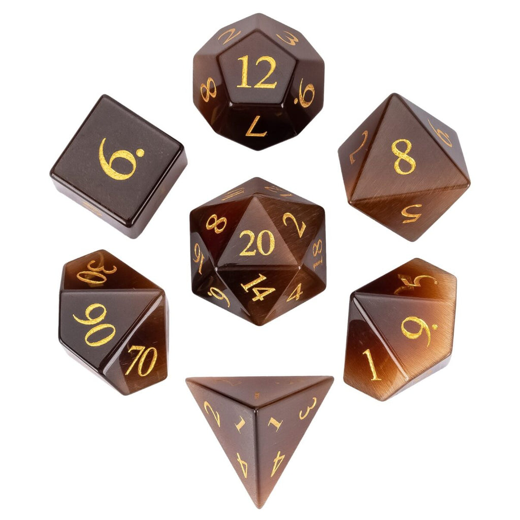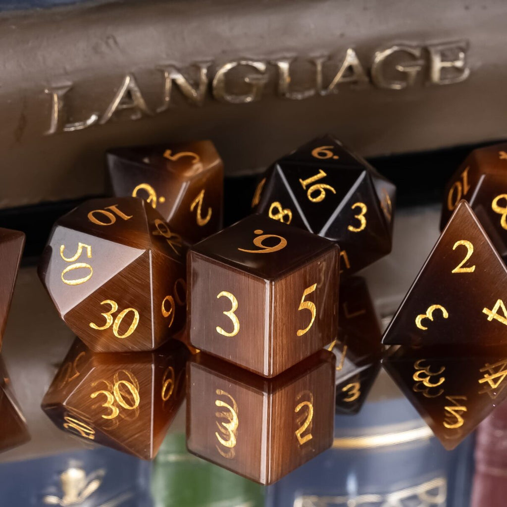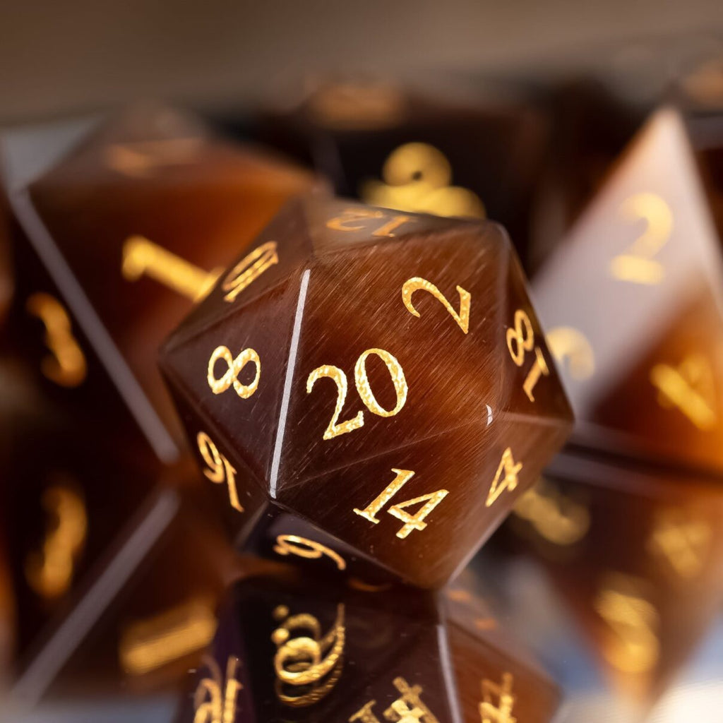 Like the eye of an ancient creature guarding forgotten treasures – the Cat’s Eye Brown dice set captures light in a unique way and directs it in soft, golden-brown beams over its flawlessly cut facets.