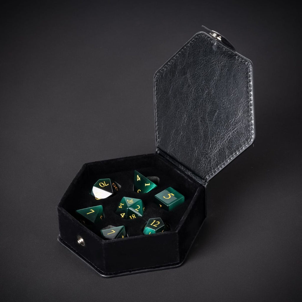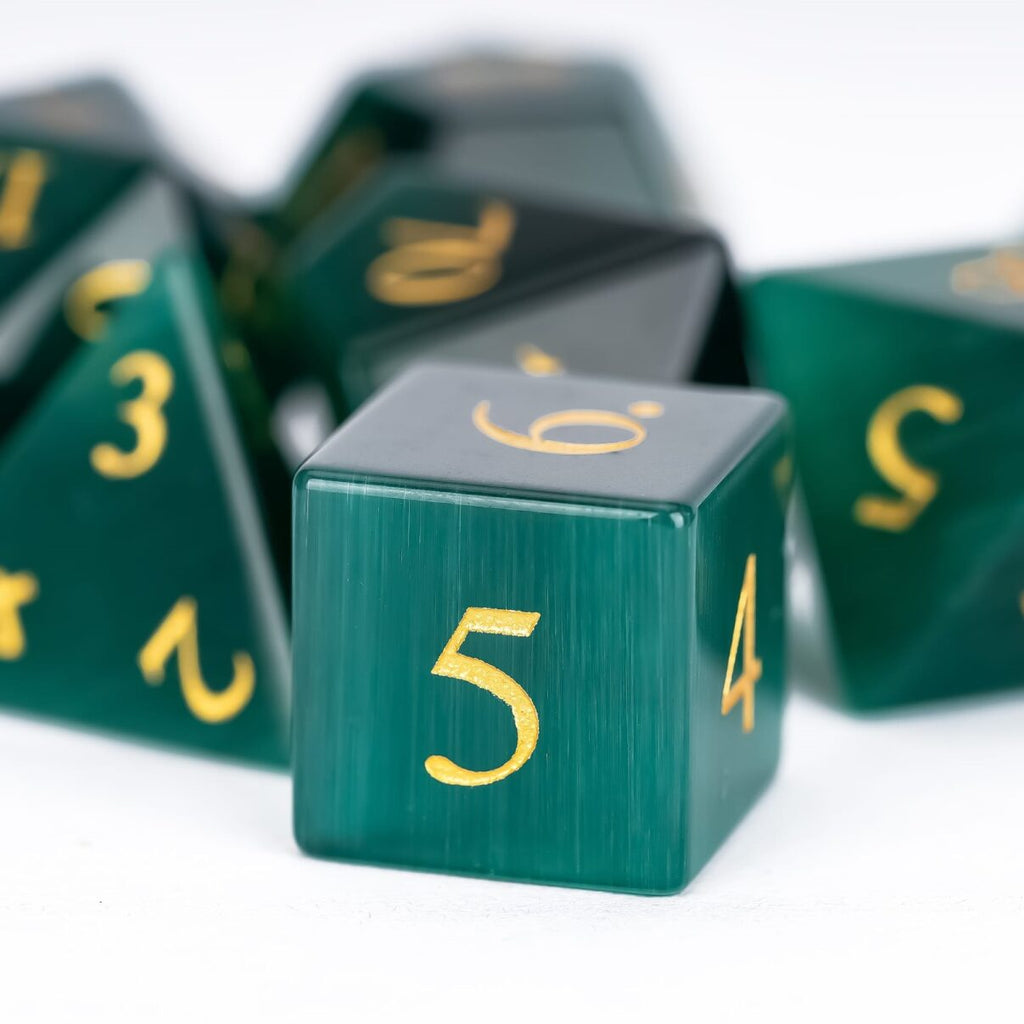 Crafted from noble Cat's Eye, each of these Dice reveals the fascinating chatoyance effect – a silky flowing line of light that moves across the flawlessly polished facets.