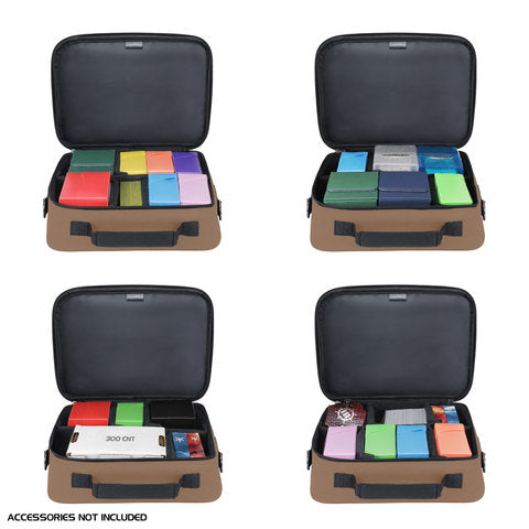The interior features customizable dividers (1 large / 4 small) to individually organize deck boxes, card sleeves, dice bags, or accessories.