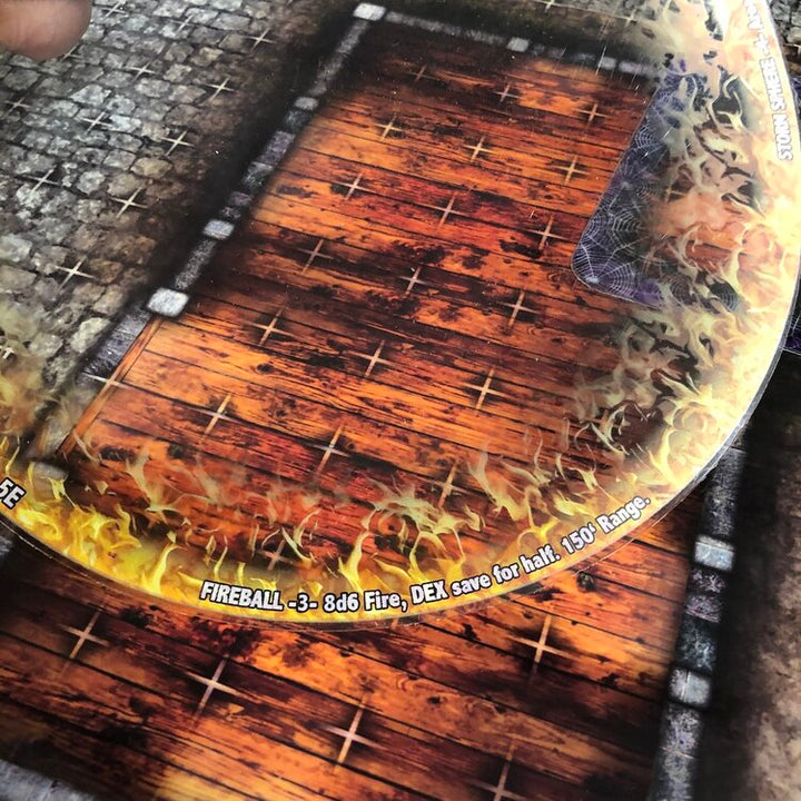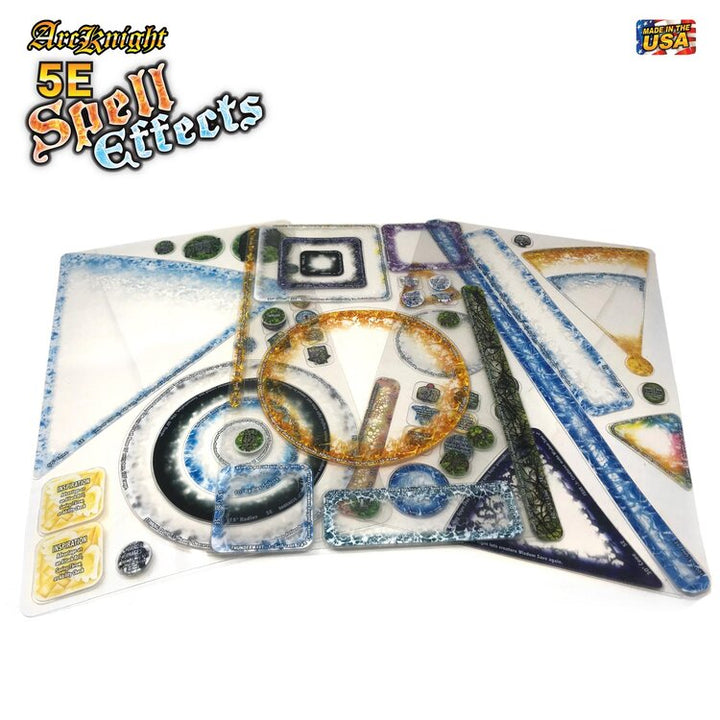 This three-page set of spell effects is pre-cut and comes filled to the brim with every shape and style to represent all your Dungeons & Dragons 5E spells. Each shape has graphic textures that are printed on thin but sturdy transparent polycarbonate sheets are printed. The set includes 24 spell templates, numerous buff and reference tokens, incantation/unit tokens and inspiration tokens.