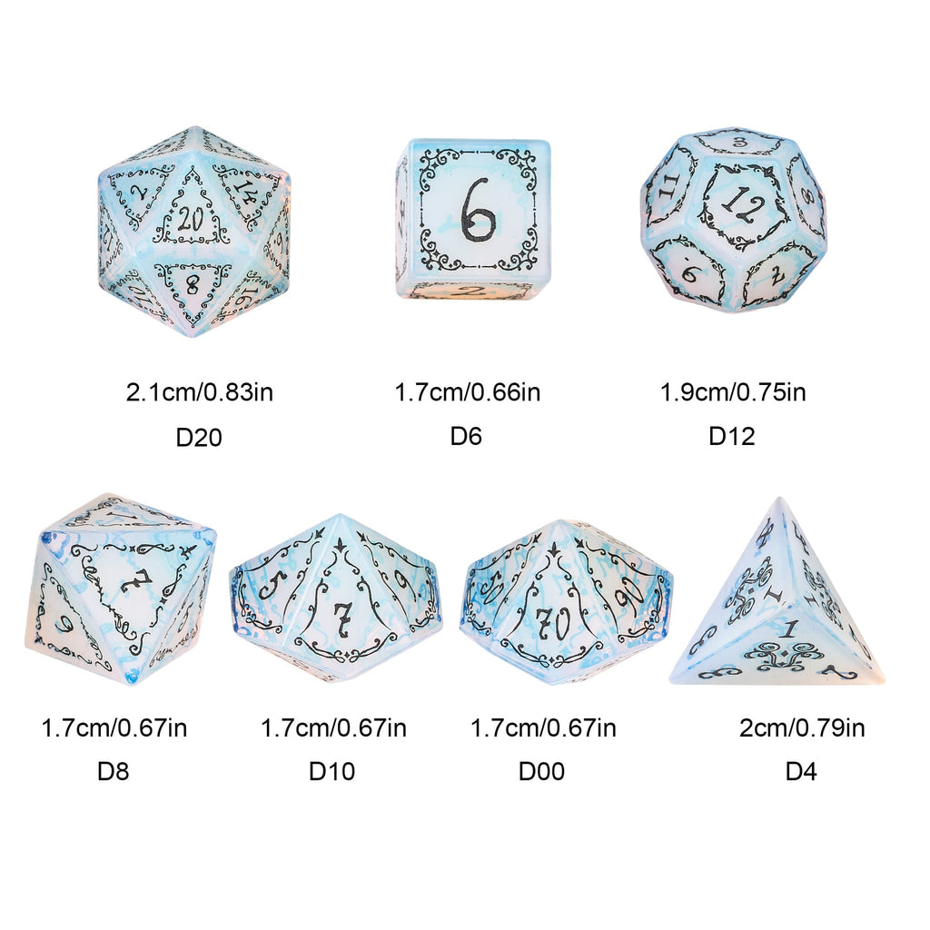 Set of 7 Opalite Dice: D4, D6, D8, D10, D12, D20, and D00