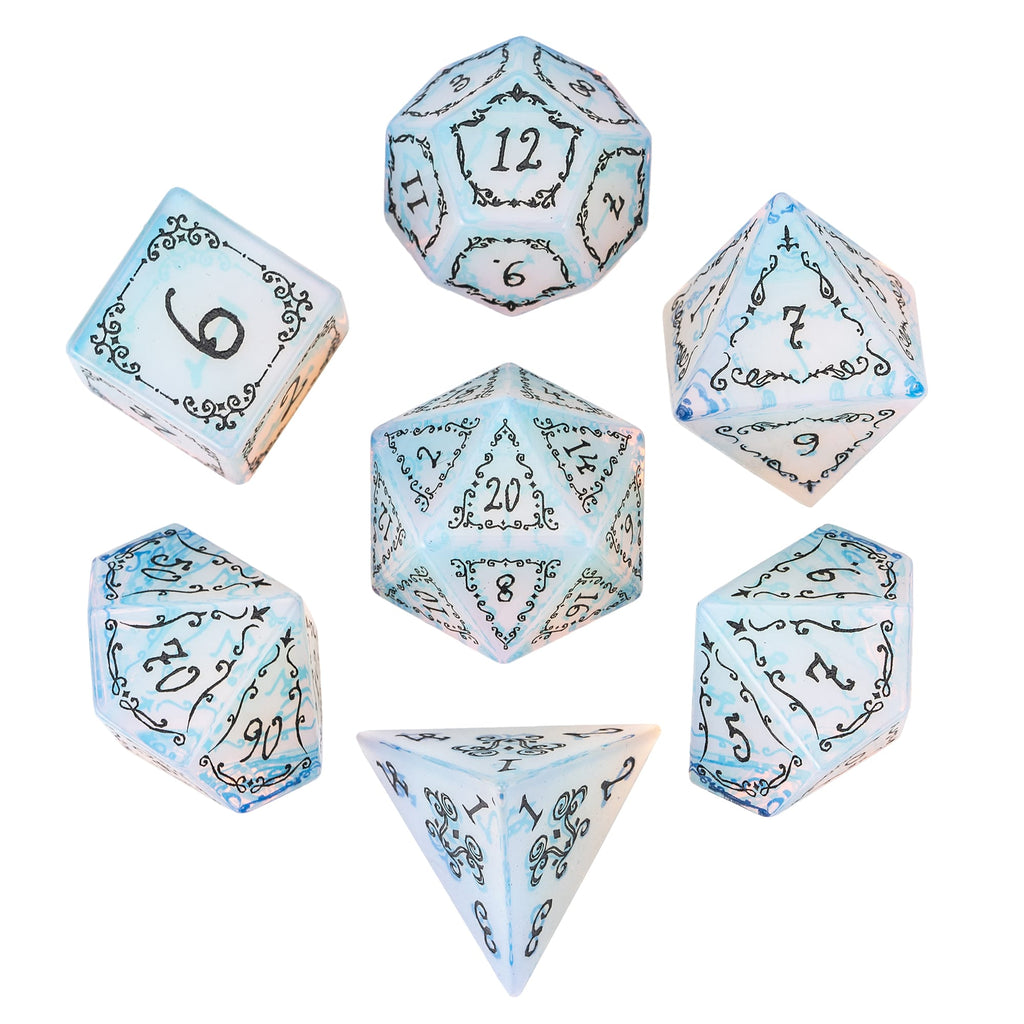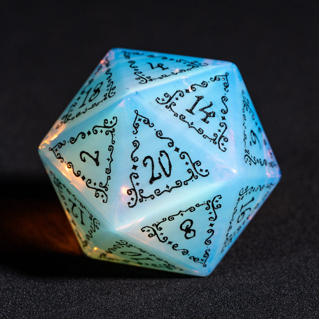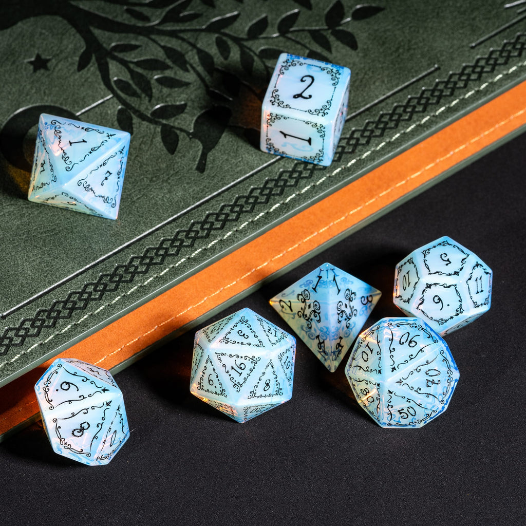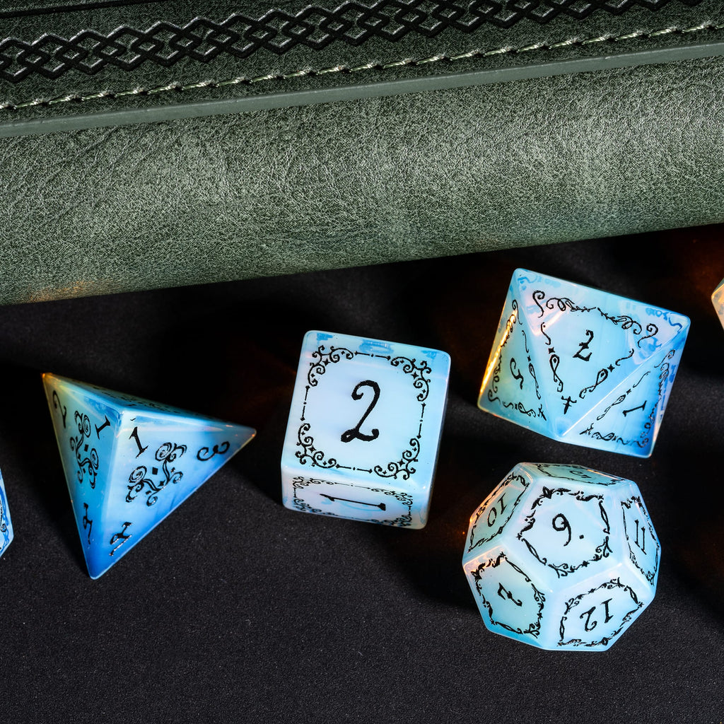 Crafted from shimmering, opaque opalite, the Dice shine like enchanted moonstones. Their blue reminds of the sky after a storm – still, clear, and full of mysteries. The fine, black vine patterns run like living veins across the surfaces, giving each roll the grace of an ancient magic. Thus, every moment at the game table becomes a dance of light, magic, and timeless natural power.