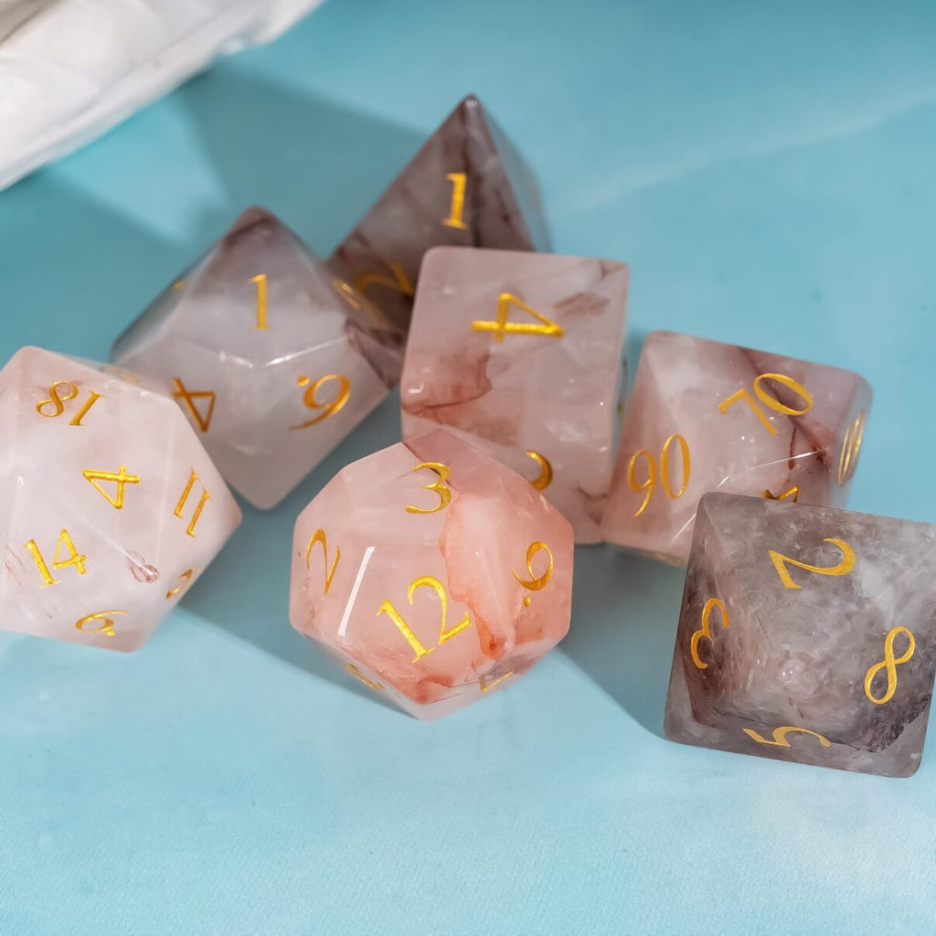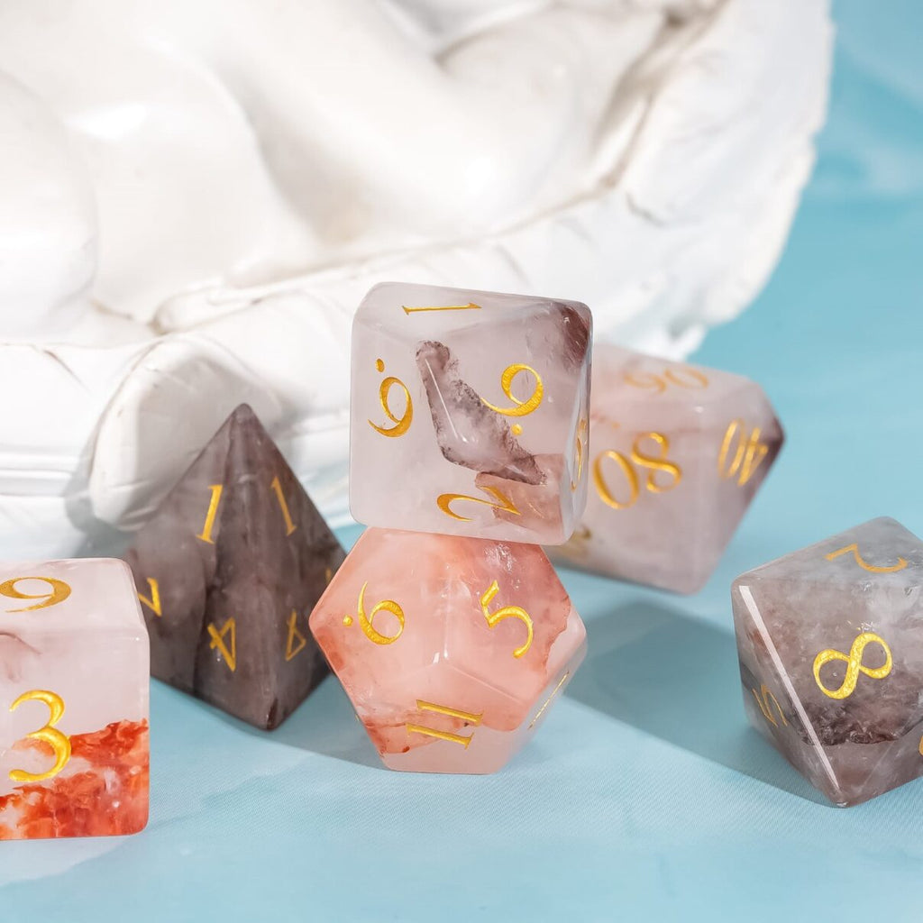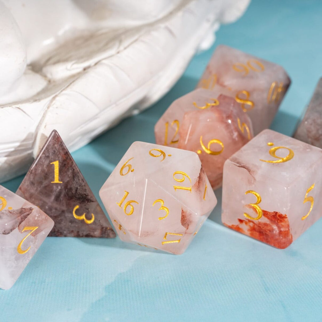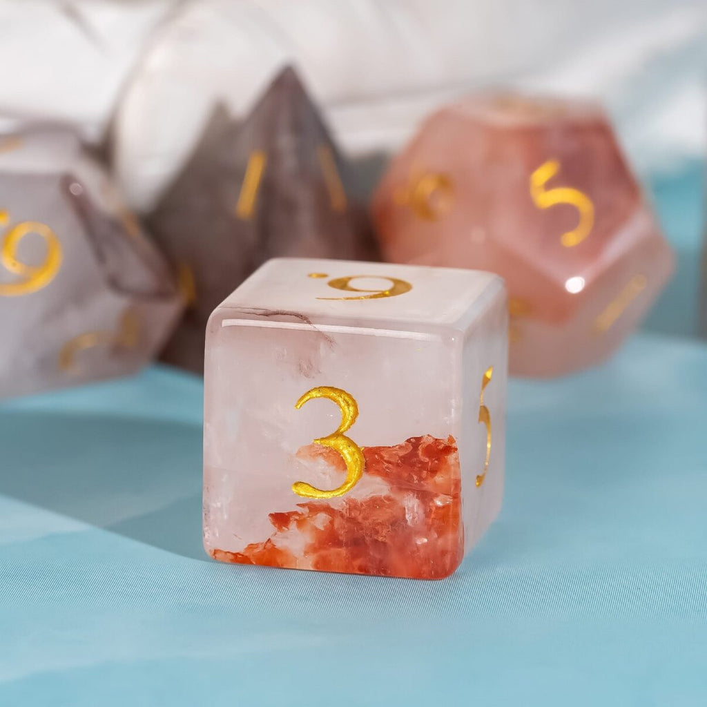 Born in the heart of the earth and shaped by the breath of time – the Eternal Fire Quartz dice set is an artifact of natural grace and ancient energy. Each of these Dice carries the flicker of eternal fire within, captured in the delicate shimmer of genuine quartz.