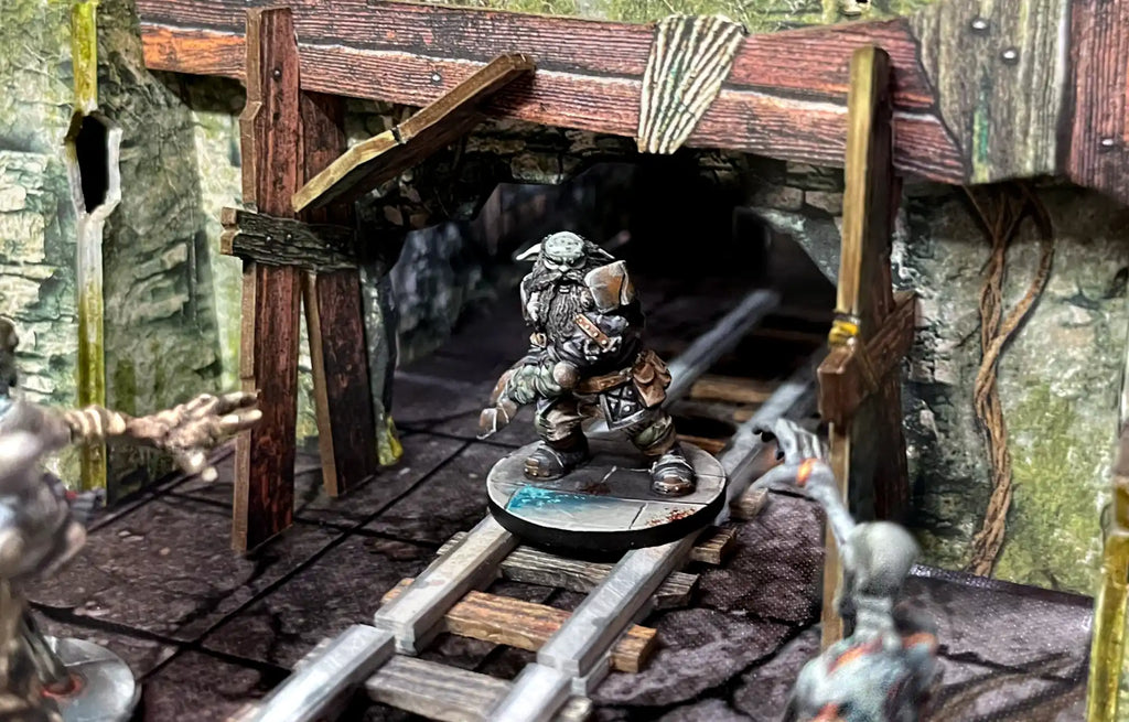 Mine set with rail system, mine carts, rock walls, and industrial elements.