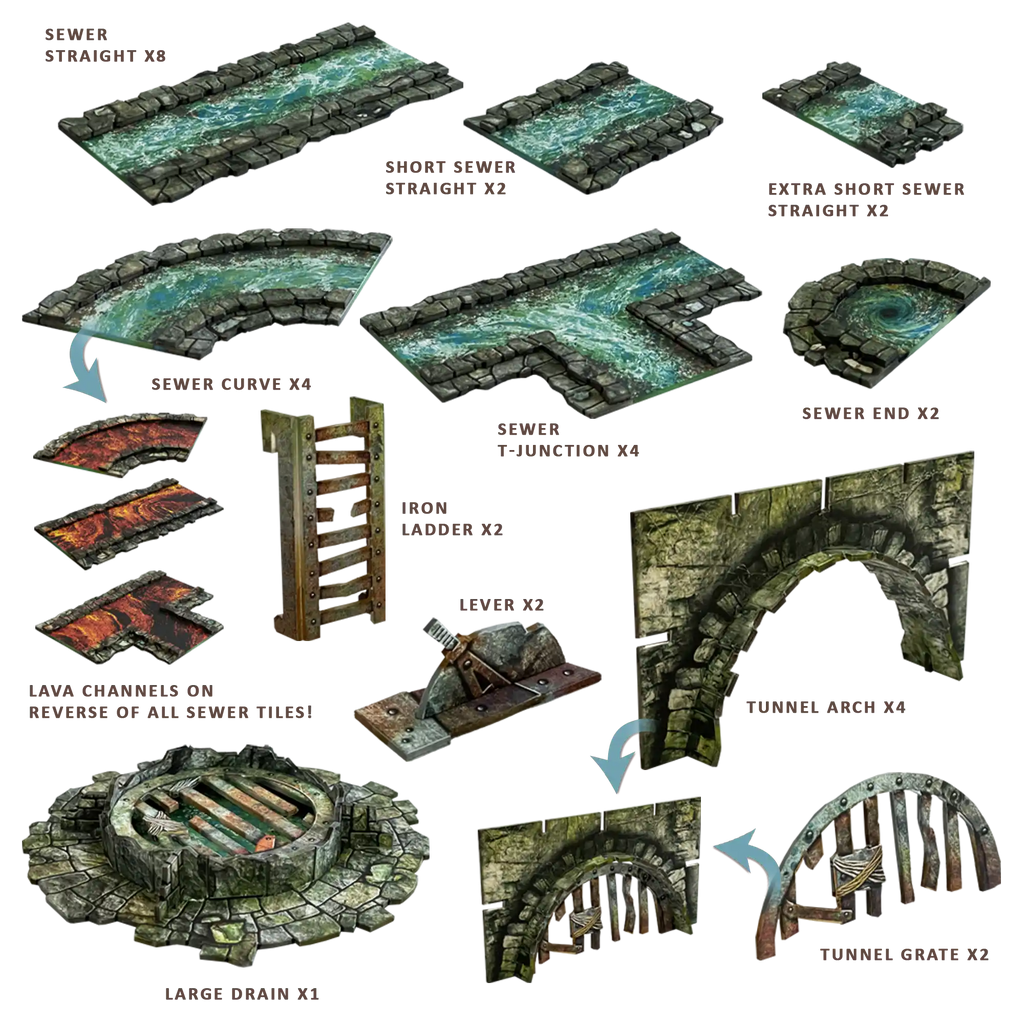 Modular sewer system with waterways and double-sided tiles for alternative lava settings.