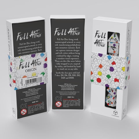 Everything begins with a roll. The Full Art Dice Set: Origin celebrates the essence of the game itself – the Dice in its purest, symbolic form. Fine lines in the shape of dice run across the white surfaces, like a pattern of countless possibilities, reminiscent of the geometry of fate. Between the lines, colorful polyhedra glow in vibrant colors – red, green, blue, yellow, and violet – like sparkling shards from another dimension. The deep black numbers stand in clear contrast and harmoniously blend into the playful, modern design.