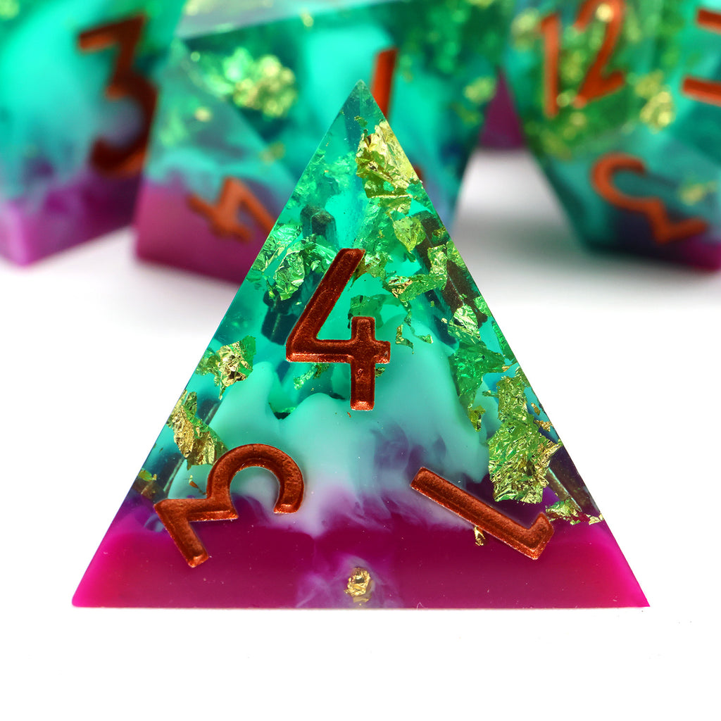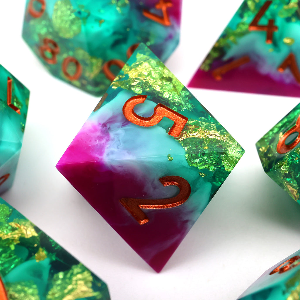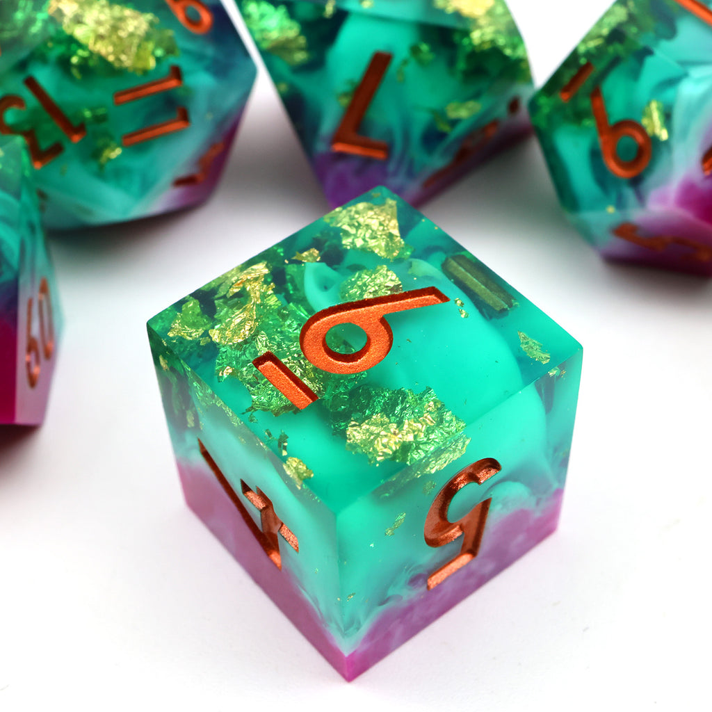 The Auramaris-Dice capture this legend precisely. Swirls of color in deep turquoise, vibrant magenta, and mysterious green tones remind of this blooming wonder, while gold fragments inside appear like sparkling pollen floating in the mist.