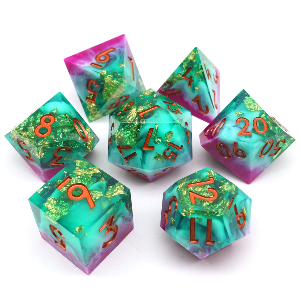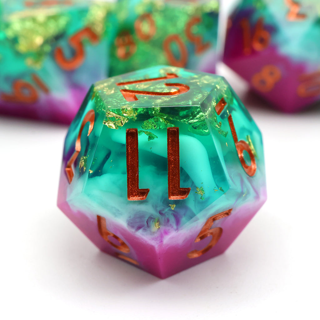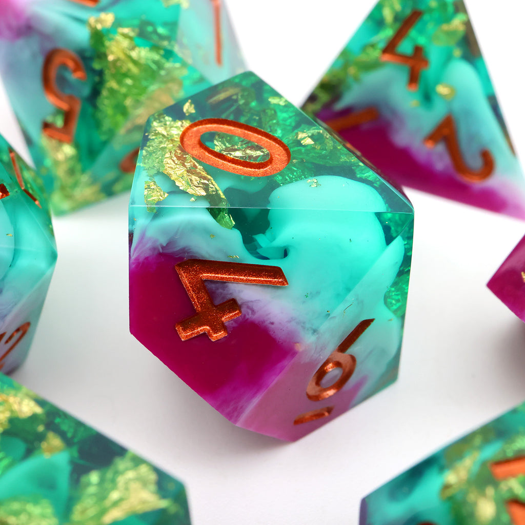 The Auramaris-Dice capture this legend precisely. Swirls of color in deep turquoise, vibrant magenta, and mysterious green tones remind of this blooming wonder, while gold fragments inside appear like sparkling pollen floating in the mist.