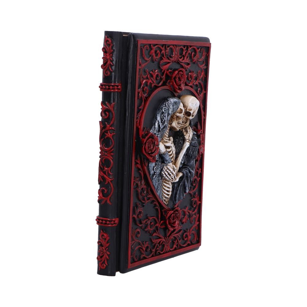 The artistically designed cover depicts a skeletal couple in a tender embrace, framed by deep red roses and delicate ornaments. This richly detailed 3D resin design combines romantic symbolism with a dark, gothic aesthetic – an expression of devotion, loss, and immortal love.