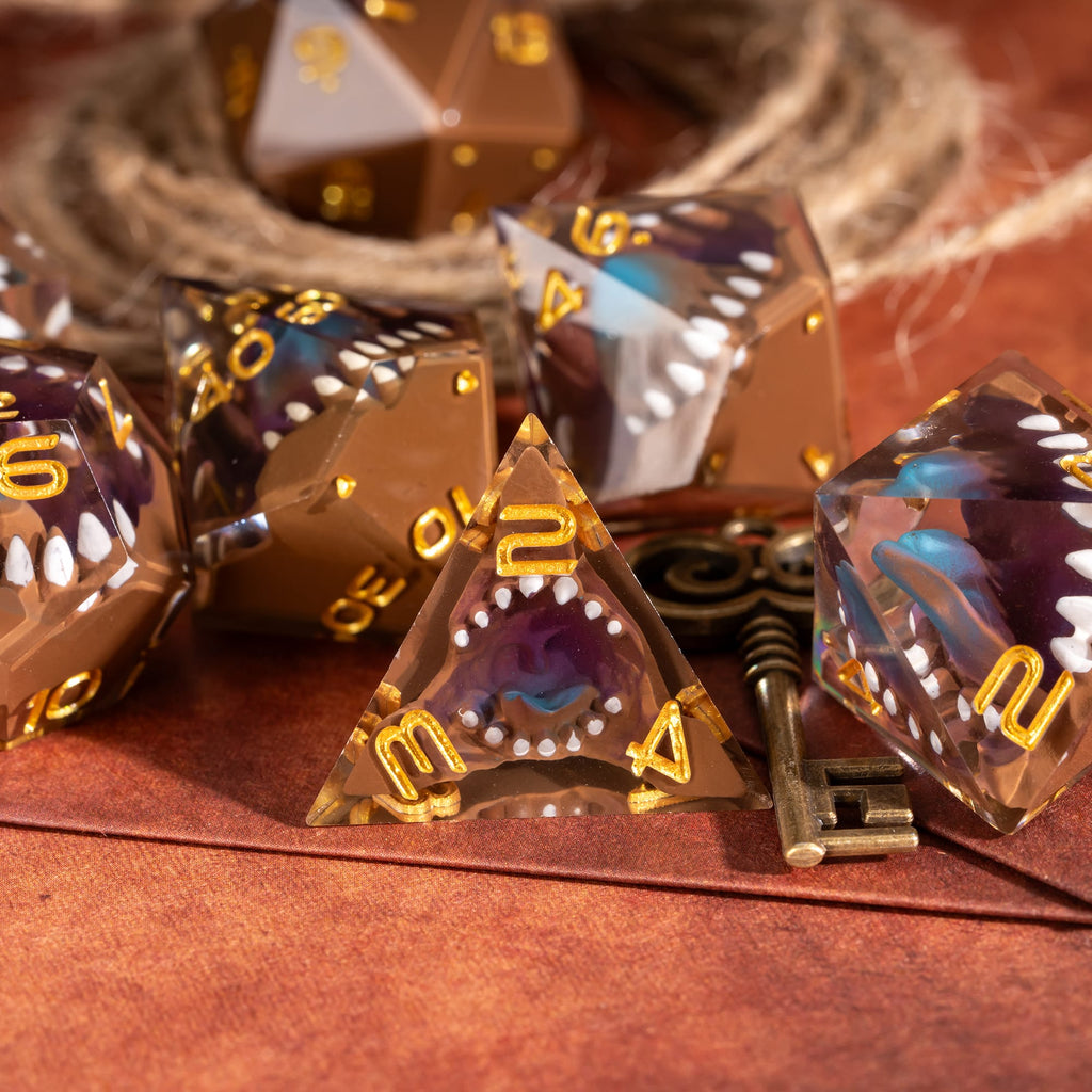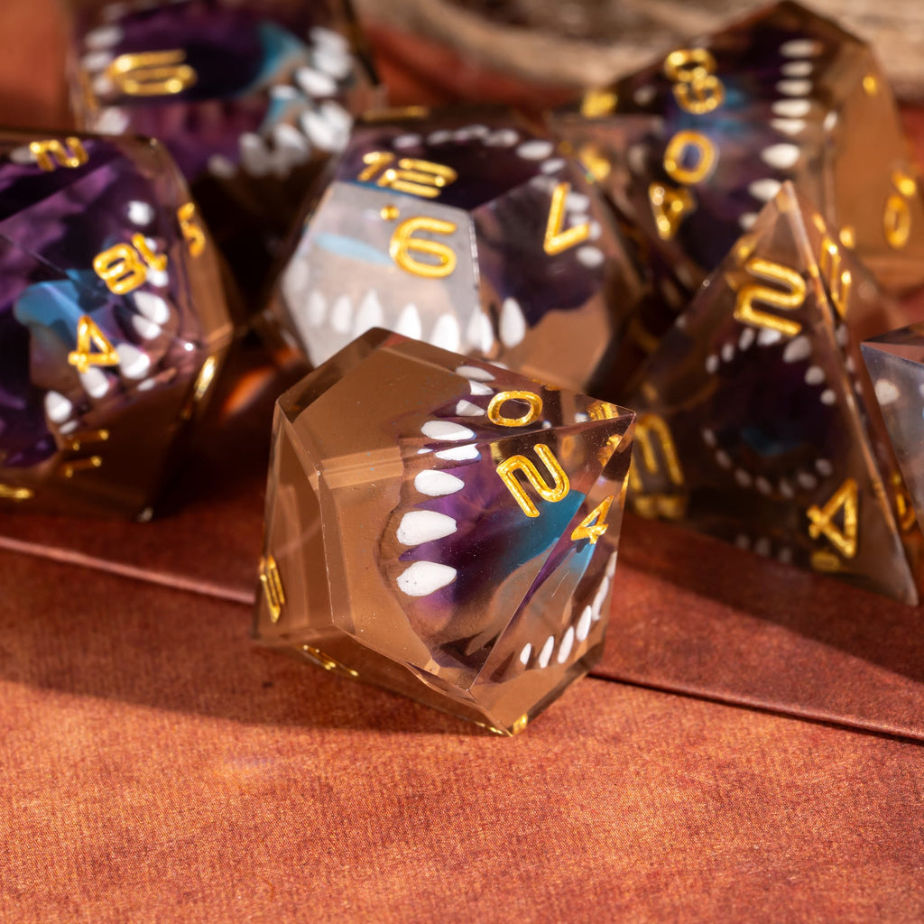 Die Mimic Dice sind nichts für unerfahrene Abenteurer. Auf den ersten Blick wirken sie wie edle, transparente Sharp-Edge-Würfel - doch im Inneren lauert etwas anderes: geöffnete Mäuler, scharfe Zähne und der Eindruck, als würden die Würfel selbst auf das nächste Opfer warten.