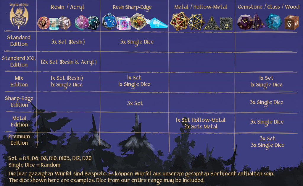 For everyone who wants the best of all worlds: A set of seven classic plastic dice, a set of noble Sharp-Edge Dice, and an exclusive set made of premium materials like glass, gemstone, or wood. Additionally, three random single dice await you (one plastic, one Sharp-Edge, and one premium Dice) to complete your Dice quest and make each door a magical moment!