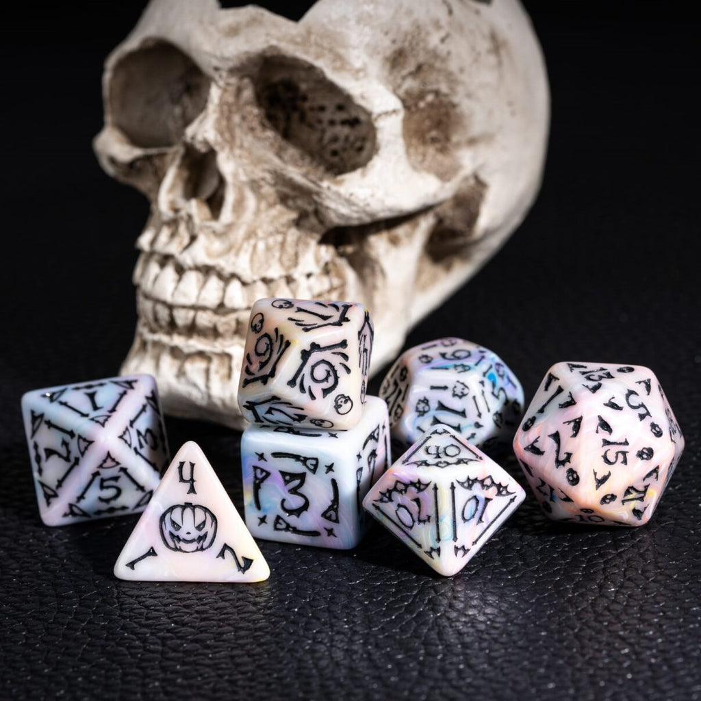 These RPG-Dice carry the veil between life and death within them. In shimmering opal white with fine pastel reflections, the Haunted Opal Dice look like cursed artifacts from an old coven. Engravings of skulls, bones, bats, and ghostly beings dance across their surface - each symbol a warning of the power that rests in these dice.