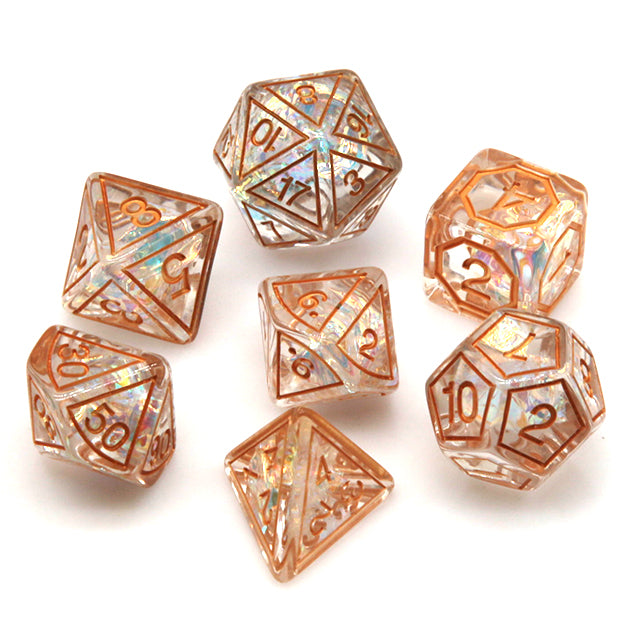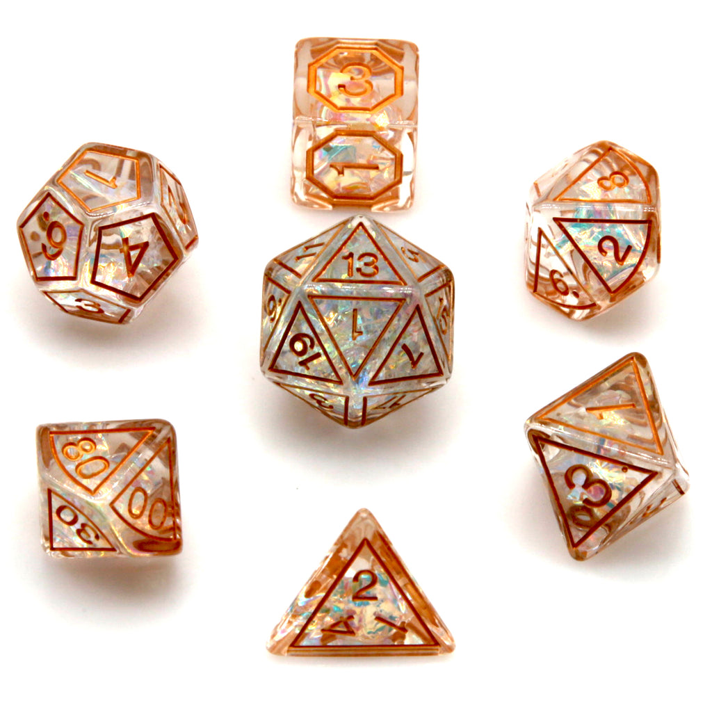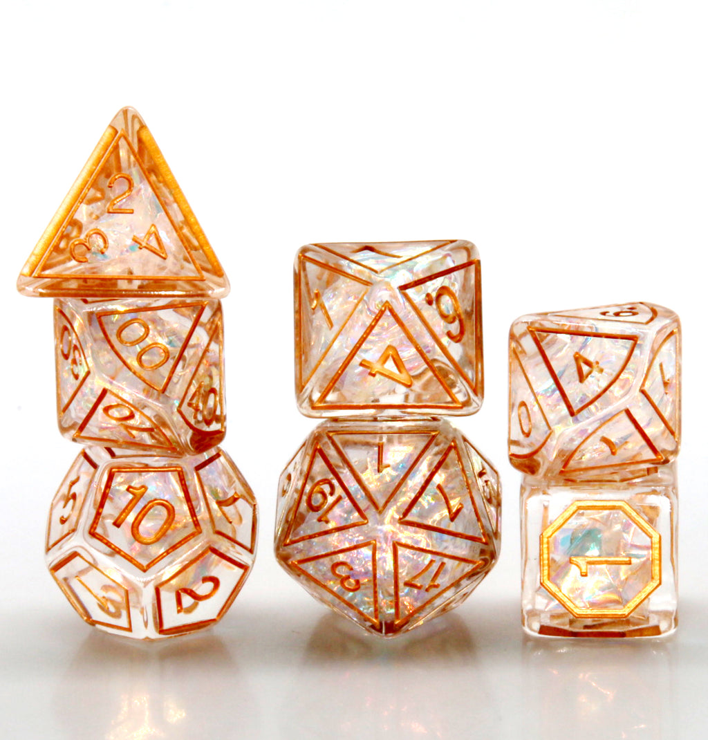When light falls on these Dice, they come to sparkling life: shimmering shards inside break the light and make them appear like glowing sparks, encased in warm gold. Every roll becomes a small spectacle of shine and depth – perfect to brighten your adventures with a touch of magic.