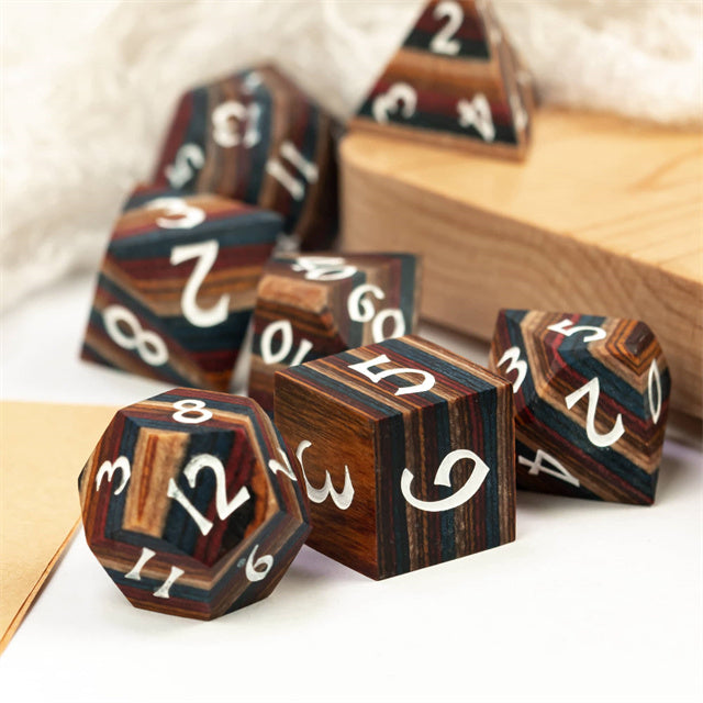 REAL WOOD DICE - Each of the 7 Dice was handcrafted from wood and provided with the numbers. Due to the unique grain of the wood looks each Dice a little different.