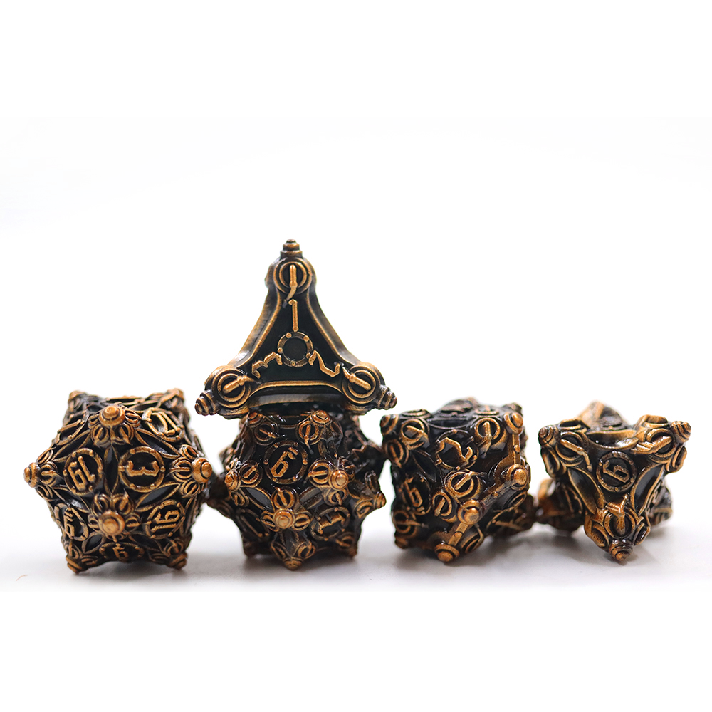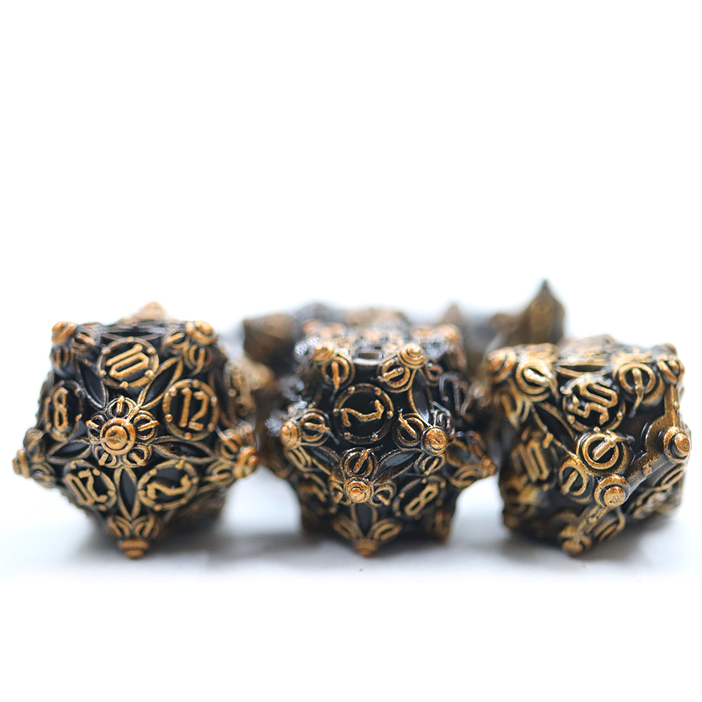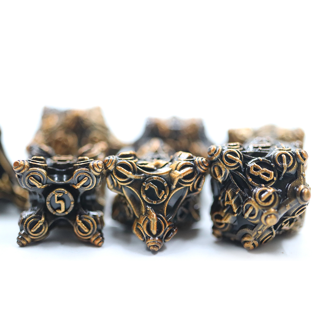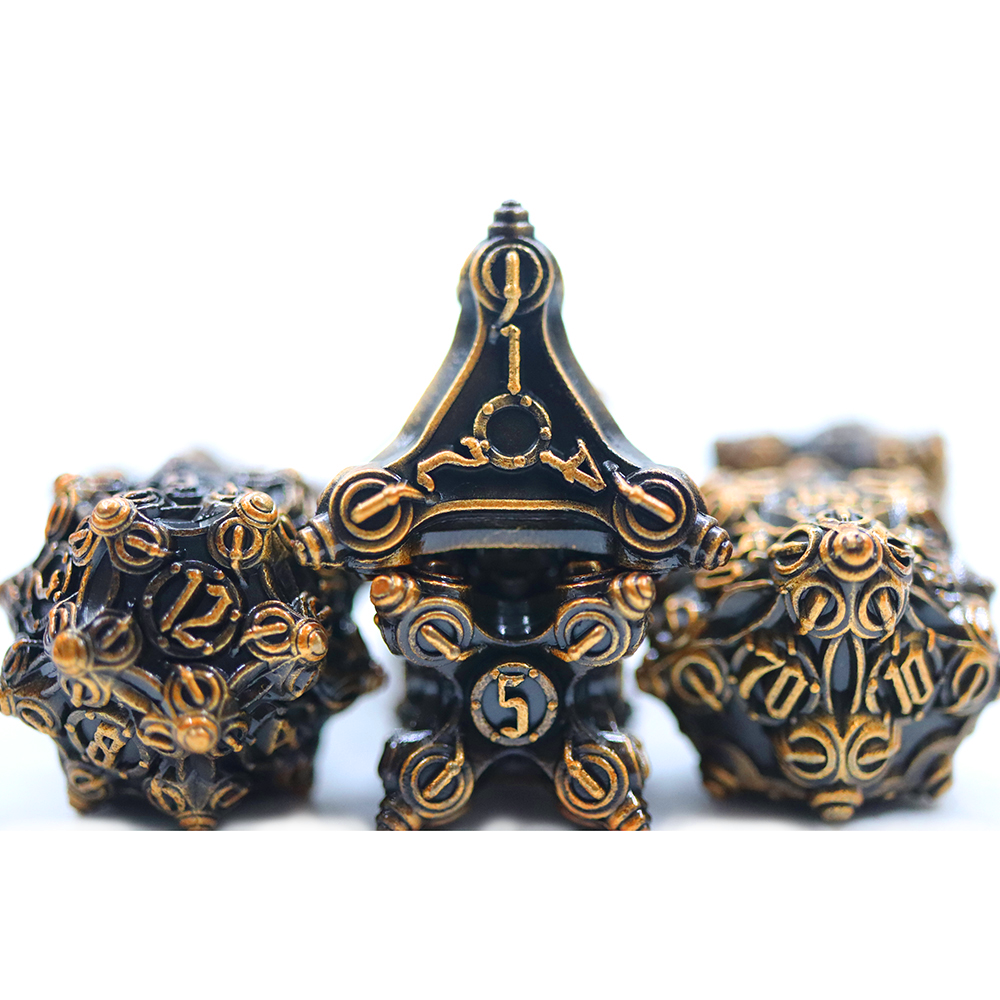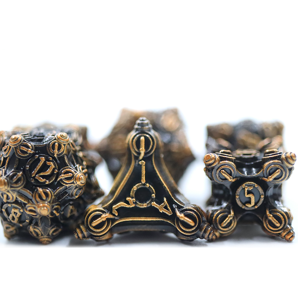 HOCHWERTIGE METALLWÜRFEL - Die Rollenspielwürfel bestehen aus hochwertigem Metall, die Ausschmückungen an den Ecken und die außergewöhnliche Form geben den Würfeln einen mechanischen Look. Die goldenen Highlights der Ziffern und Verzierungen auf den ansonsten schwarzen Fantasywürfeln bringen dieses kunstvolle Set auf das nächste Level!