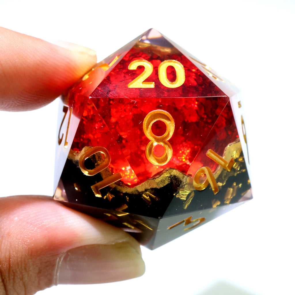 Ein intensiv roter Kern glüht wie frische Glut, eingefasst von goldenen Splitterrändern, die an die Bruchkanten einer aufgeschmolzenen Magmageode erinnern. Die äußere Schicht aus tiefschwarzem, klarem Resin wirkt wie abgekühltes Vulkangestein, das die Hitze nur mühsam zurückhält. Im Licht entfalten die Kristallsplitter funkelnde Reflexe, die den Würfel bei jeder Bewegung lebendig wirken lassen.
