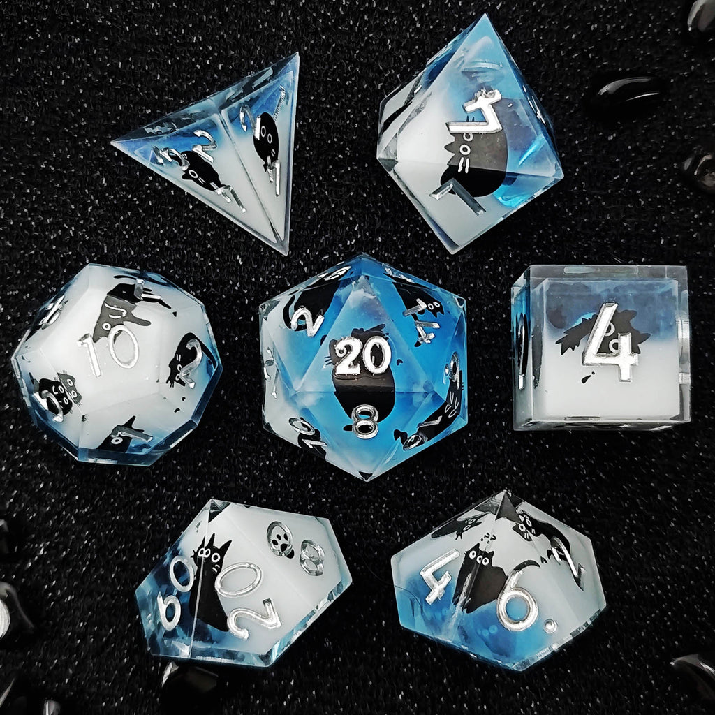 Sie schleichen nicht durch Schatten - sie tanzen durch den Himmel. Criti-Cat - Sky Adventures ist die himmlische Variante unserer beliebten Katzenwürfel und verbindet verspielten Charme mit der Frische offener Lüfte. Kristallklares Resin trifft auf sanfte Wolken- und Himmelstöne in Blau und Weiß, durchzogen von frechen schwarzen Katzen, die scheinbar schwerelos durch die Würfel gleiten.