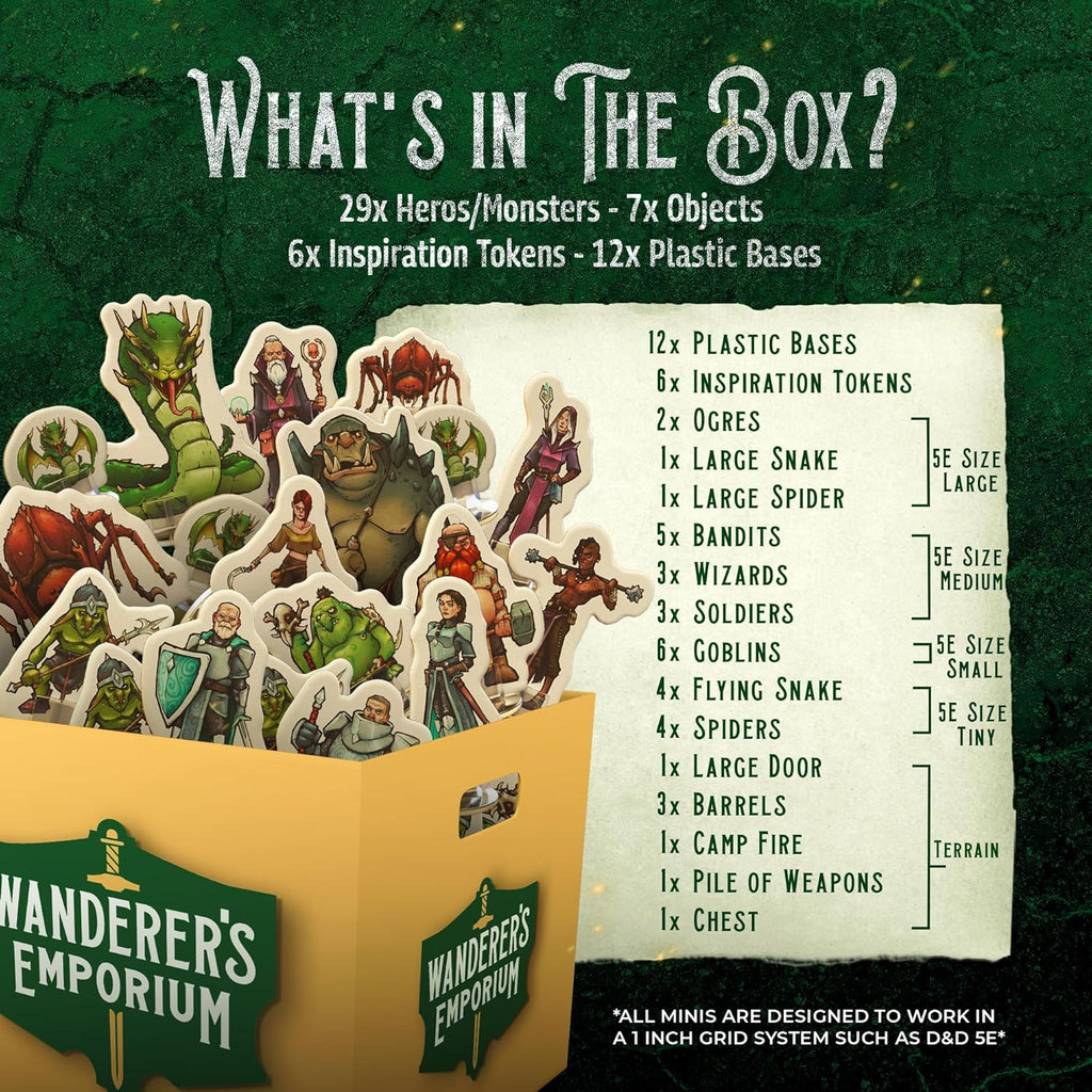 Von Zauberwirkern und tapferen Helden bis hin zu Spinnen, Goblins, Trollen und Banditen – mit insgesamt 36 hochwertigen Miniaturen kannst du sofort spannende Begegnungen und epische Kämpfe gestalten. Auch Schätze, Terrain und Tokens sind enthalten, um deine Welt noch lebendiger und immersiver zu machen.