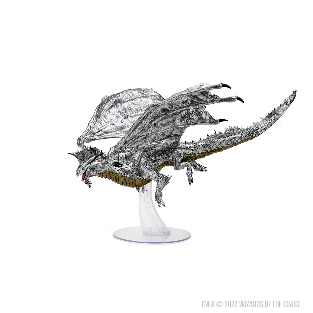 Diese hochwertige, vorbemalte Miniatur zeigt einen majestätischen Erwachsenen Silberdrachen, eine der edelsten Kreaturen der D&D-Welt. Detailreich gestaltet und aufwendig bemalt, eignet sich diese Figur perfekt als eindrucksvolles Schaufensterstück oder als imposanter Begegnungsgegner – oder gar als Verbündeter deiner Heldengruppe.