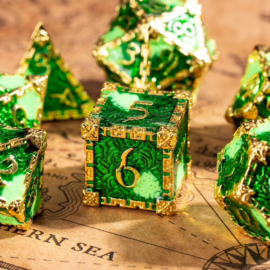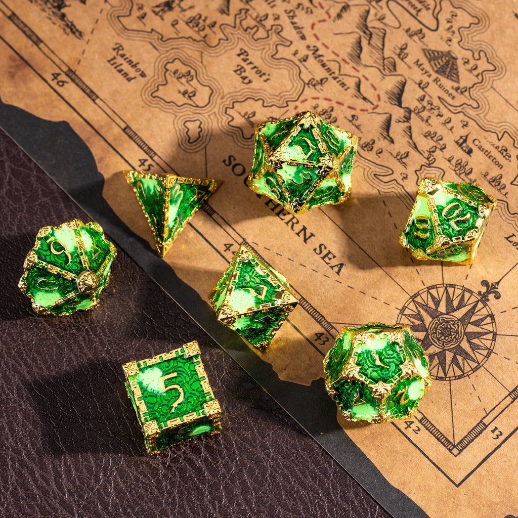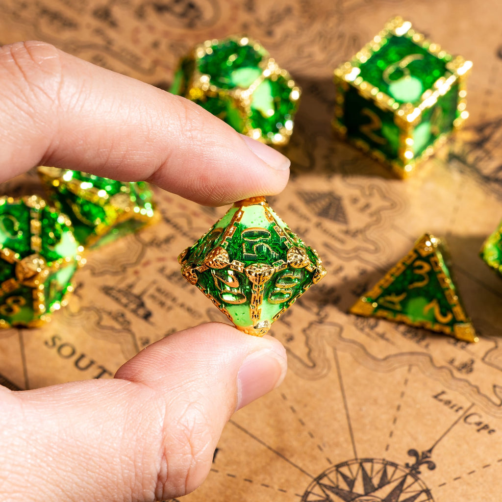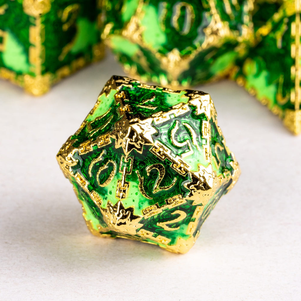 Die Deadly Dagger - Green Dream Würfel fangen genau dieses Gefühl ein: ein leuchtendes, fast lebendiges Grün, das von goldenen Akzenten durchzogen wird wie Sonnenlicht, das durch Blätter fällt.