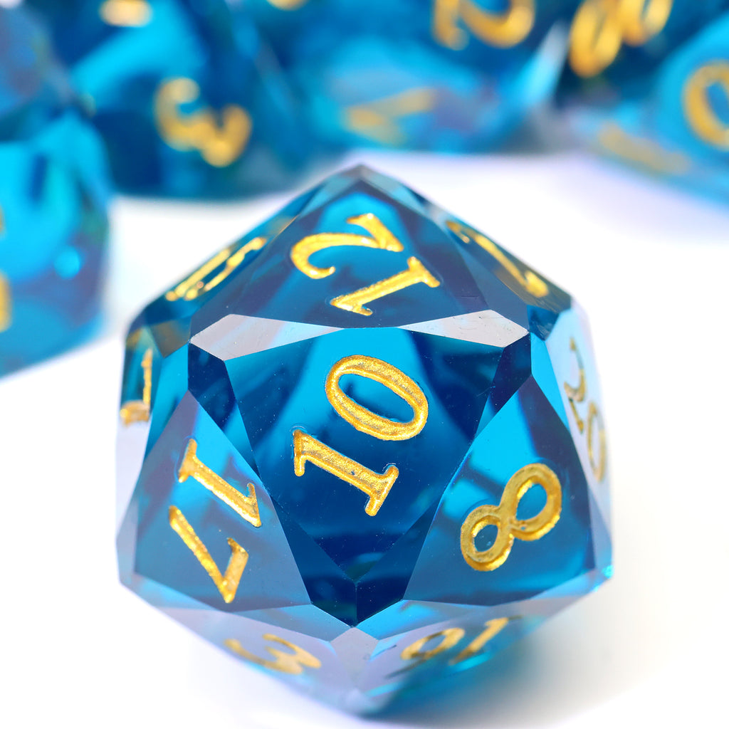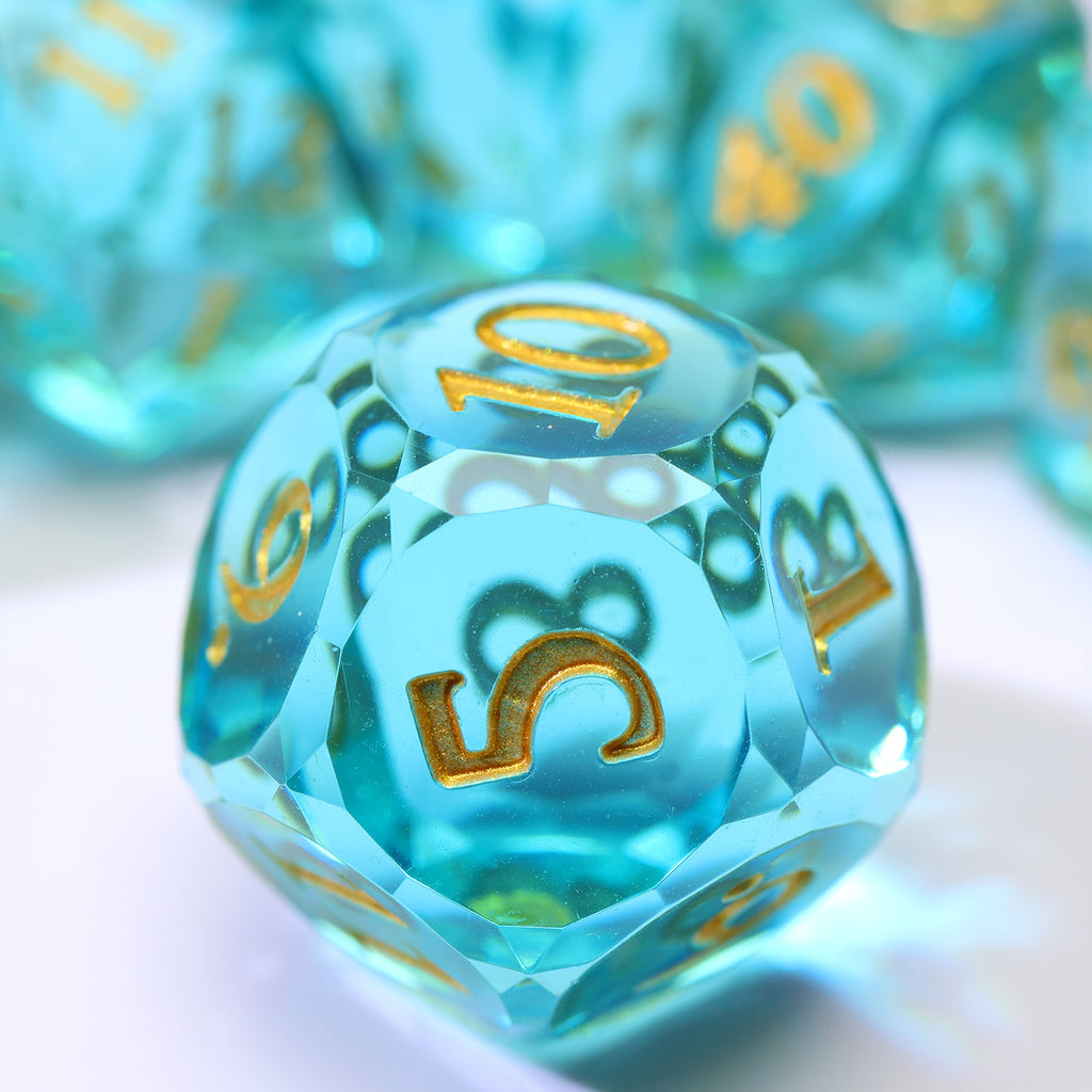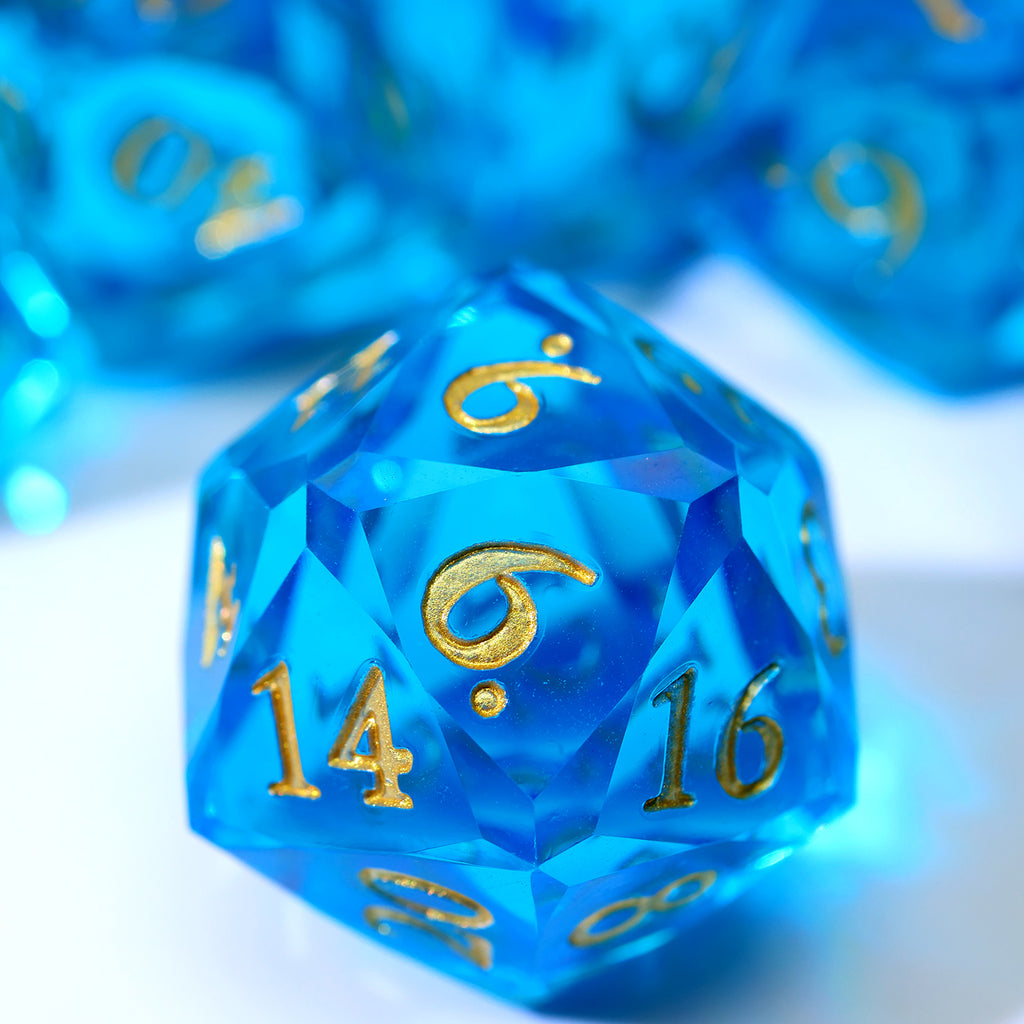 Die Aether Essence (Diamondcut) Würfel sind genau solche magischen Kristalle. Durch ihre präzise geschliffenen Kanten im Diamond-Cut-Stil brechen sie das Licht in vielen Facetten und verleihen jedem Wurf ein intensives Funkeln. Das klare Epoxidharz sorgt für brillante Transparenz, während die goldenen Zahlen elegant auf der Oberfläche schimmern.