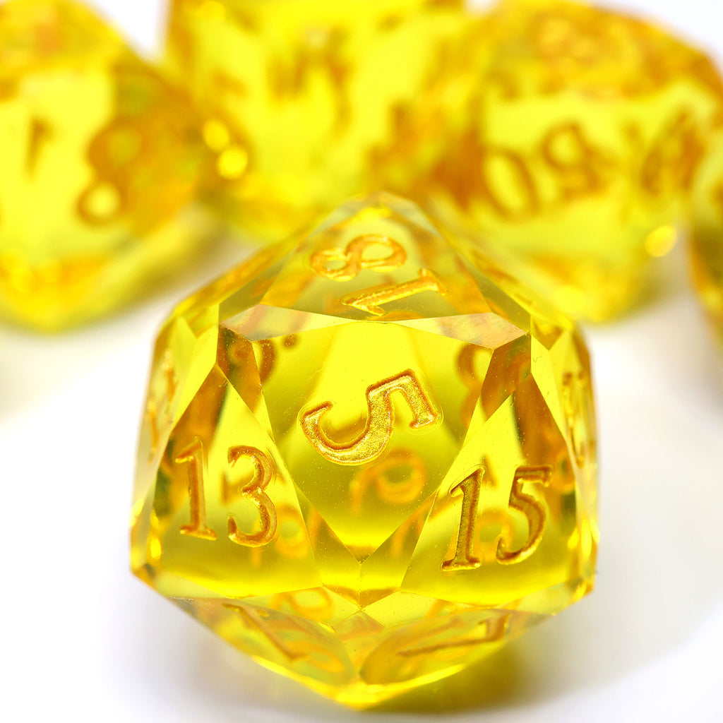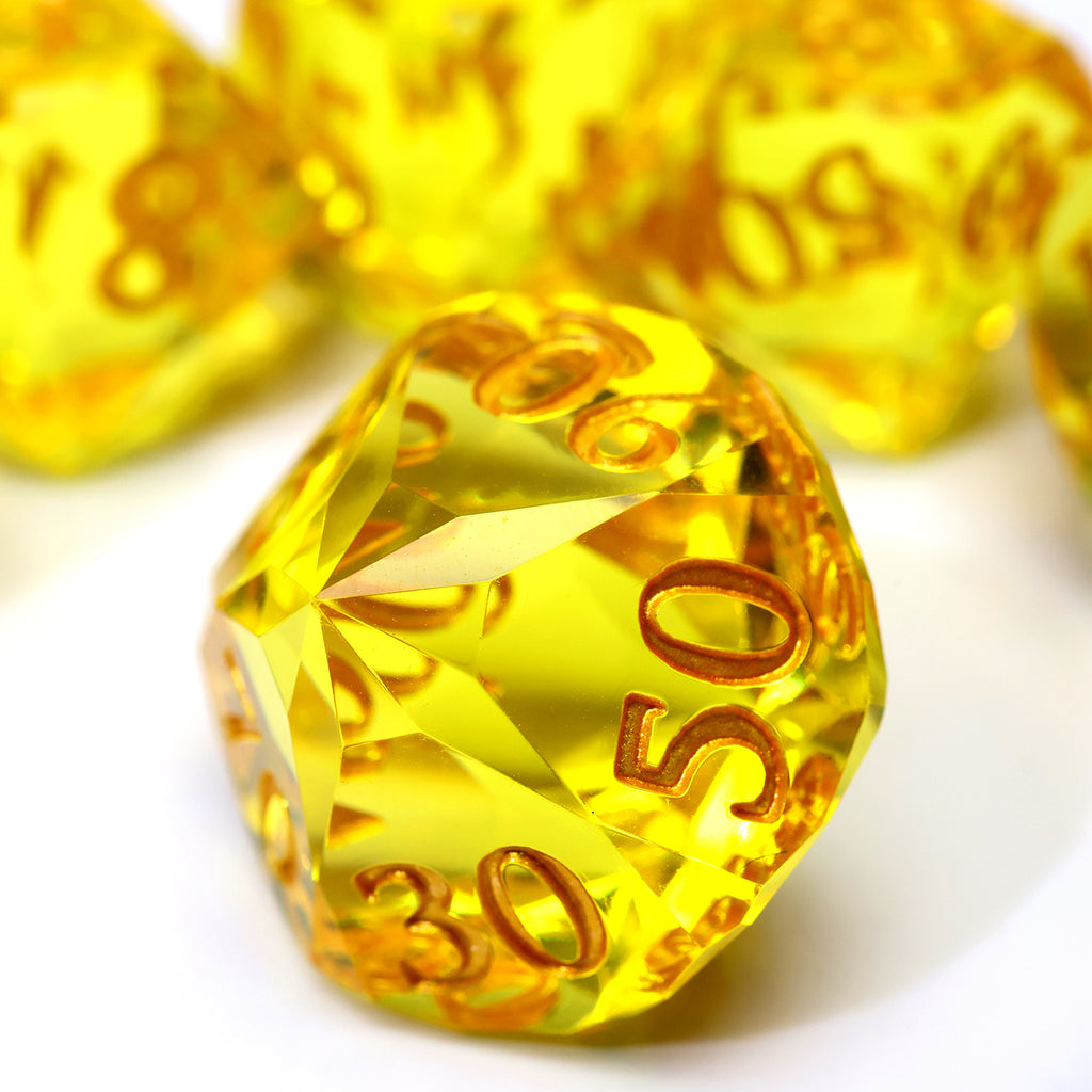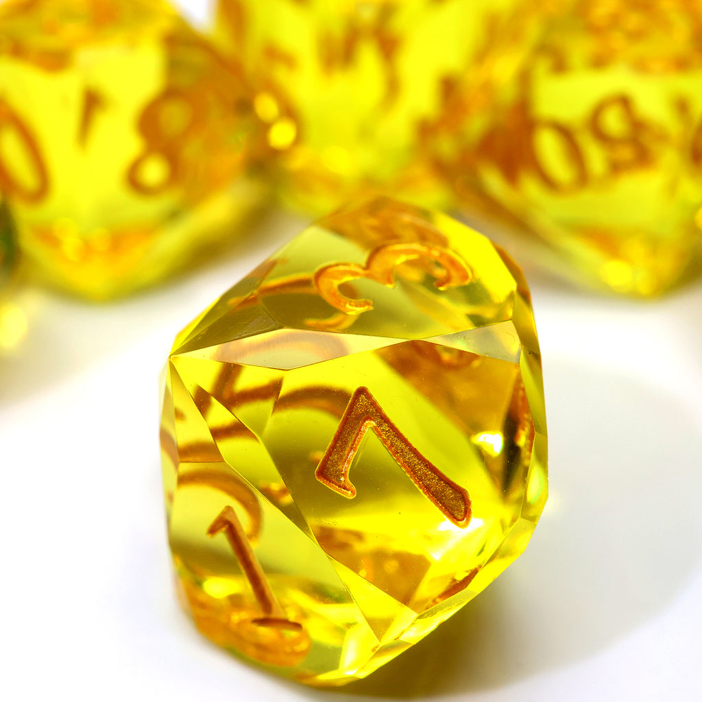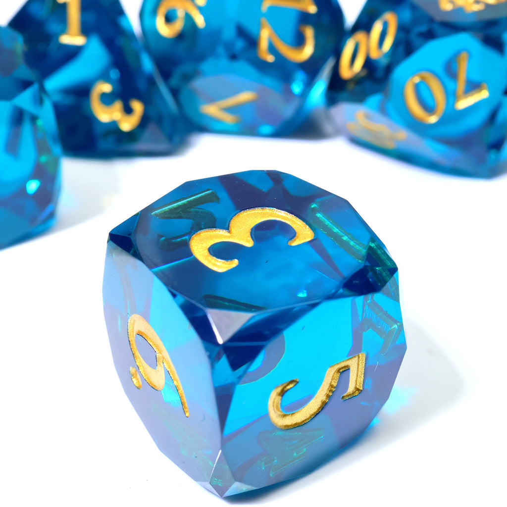 Die Aether Essence (Diamondcut) Würfel sind genau solche magischen Kristalle. Durch ihre präzise geschliffenen Kanten im Diamond-Cut-Stil brechen sie das Licht in vielen Facetten und verleihen jedem Wurf ein intensives Funkeln. Das klare Epoxidharz sorgt für brillante Transparenz, während die goldenen Zahlen elegant auf der Oberfläche schimmern.