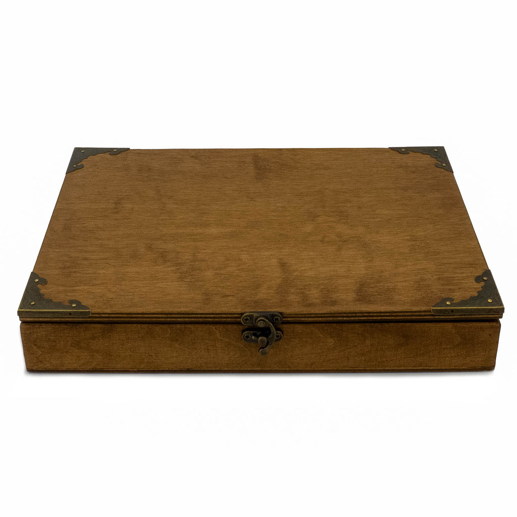 Die hochwertige Box aus geleimten Birkenholz überzeugt mit natürlicher Optik und solider Verarbeitung. Der stabile und rustikal anmutende Metallverschluss hält das Case sicher geschlossen, selbst wenn der Transport zur nächsten Spielrunde eher an eine Reise durch unwegsame Dungeons erinnert.