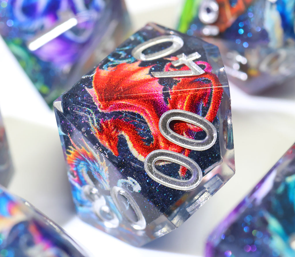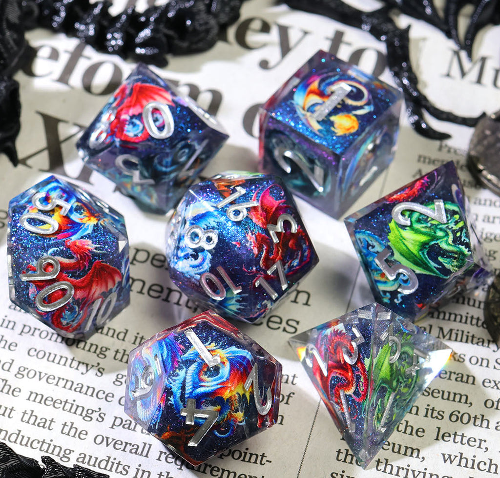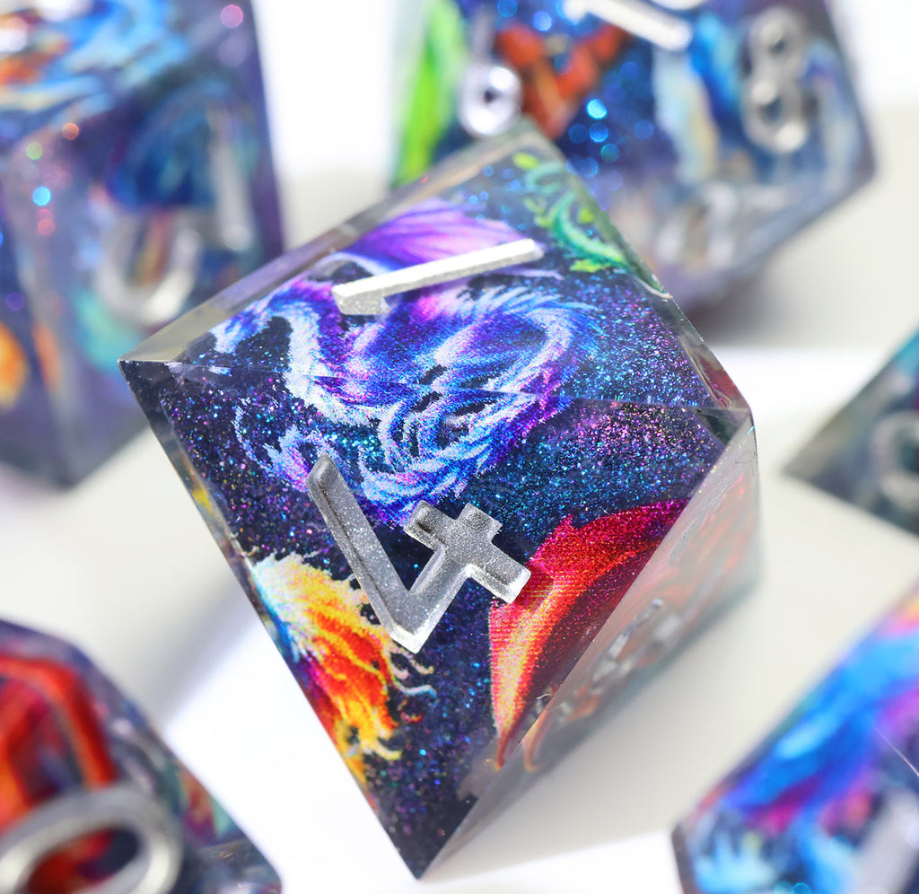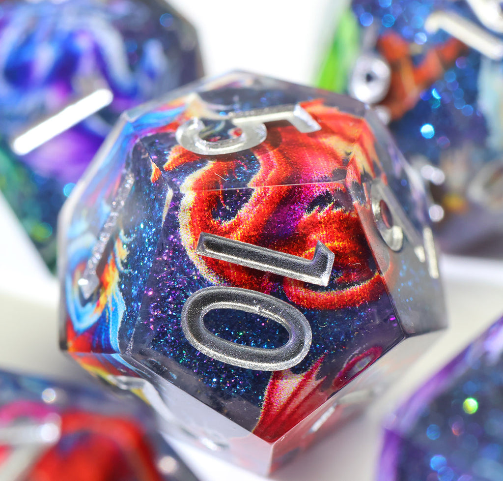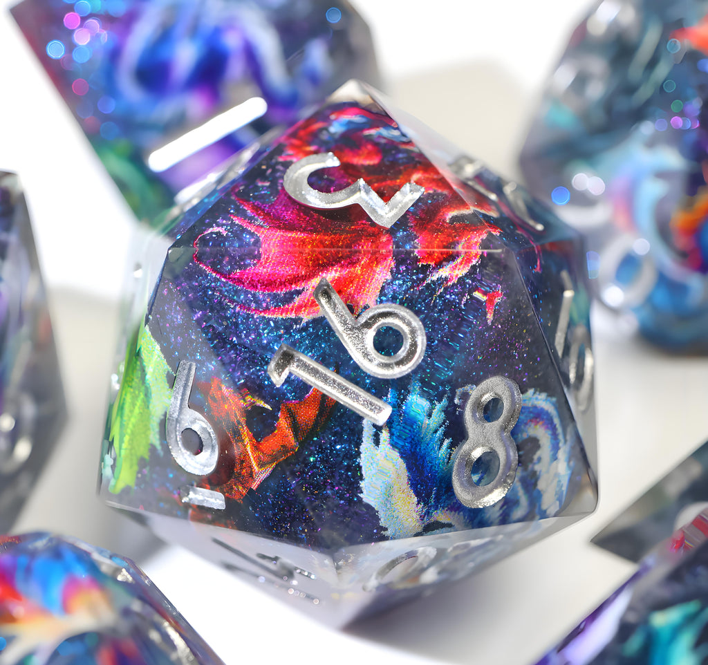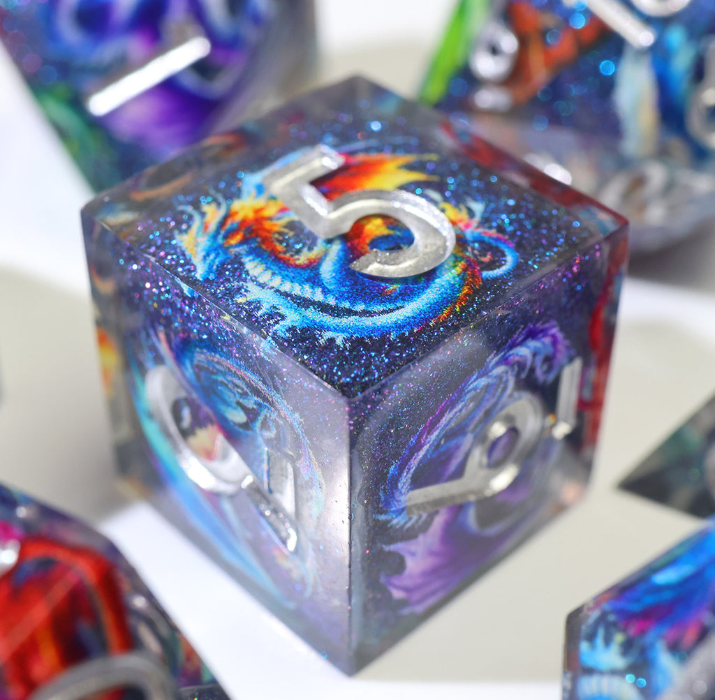 Im Inneren jedes Würfels schweben farbenprächtige Drachen durch eine funkelnde, tiefblaue Galaxie. Wie Sternbilder, die sich im Universum bewegen, scheinen sie bei jedem Wurf lebendig zu werden und begleiten dich auf deinen Abenteuern.