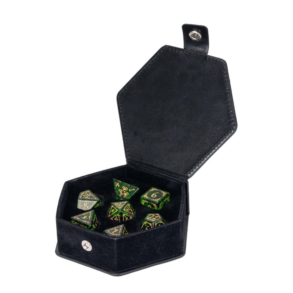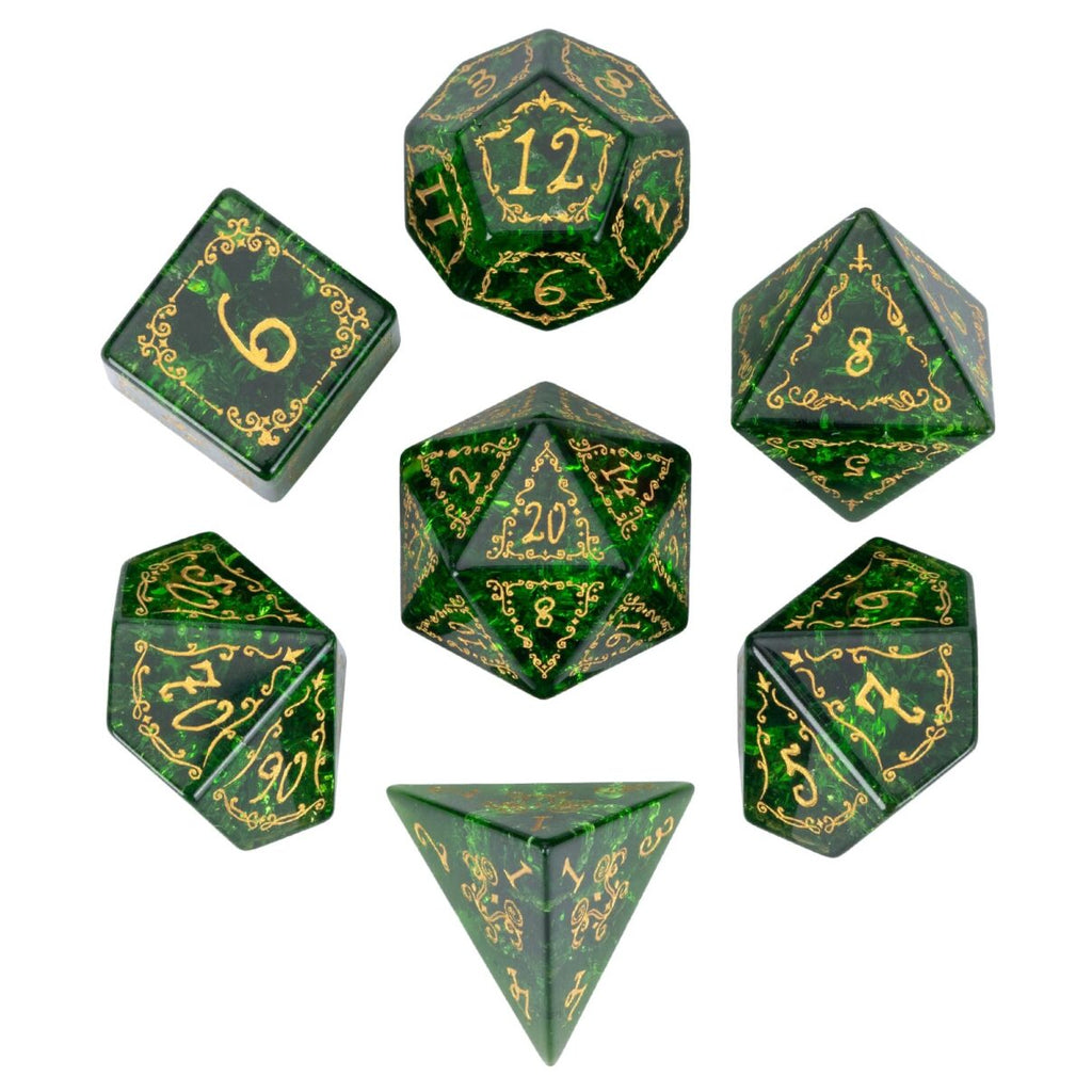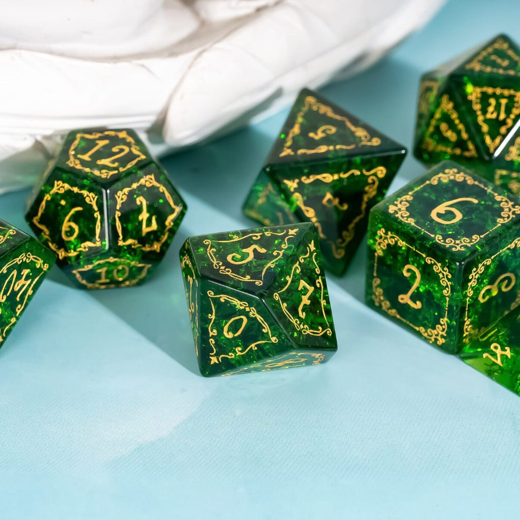 Gefertigt aus Glas mit zersprungenem Effekt, brechen die Würfel das Licht in unzählige grüne Schattierungen – mal sanft wie junger Farn im Morgentau, mal tief wie das Herz alter Wälder. Die goldenen Gravuren aus ornamentalen Rankenmustern wirken wie lebendige Wurzeln, die über die Facetten fließen und das Glas mit dem Geist der Natur erfüllen.
