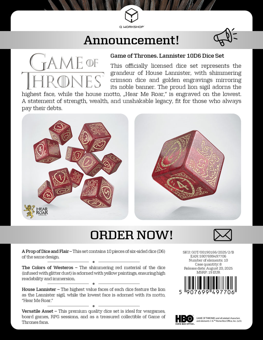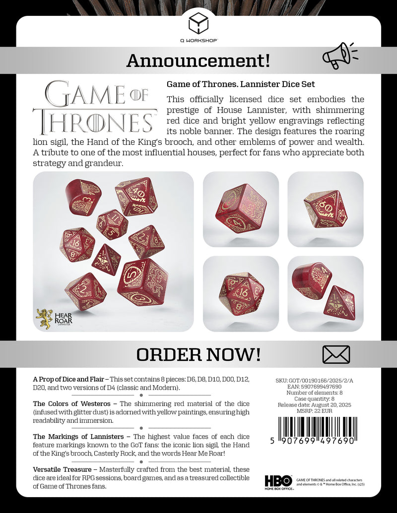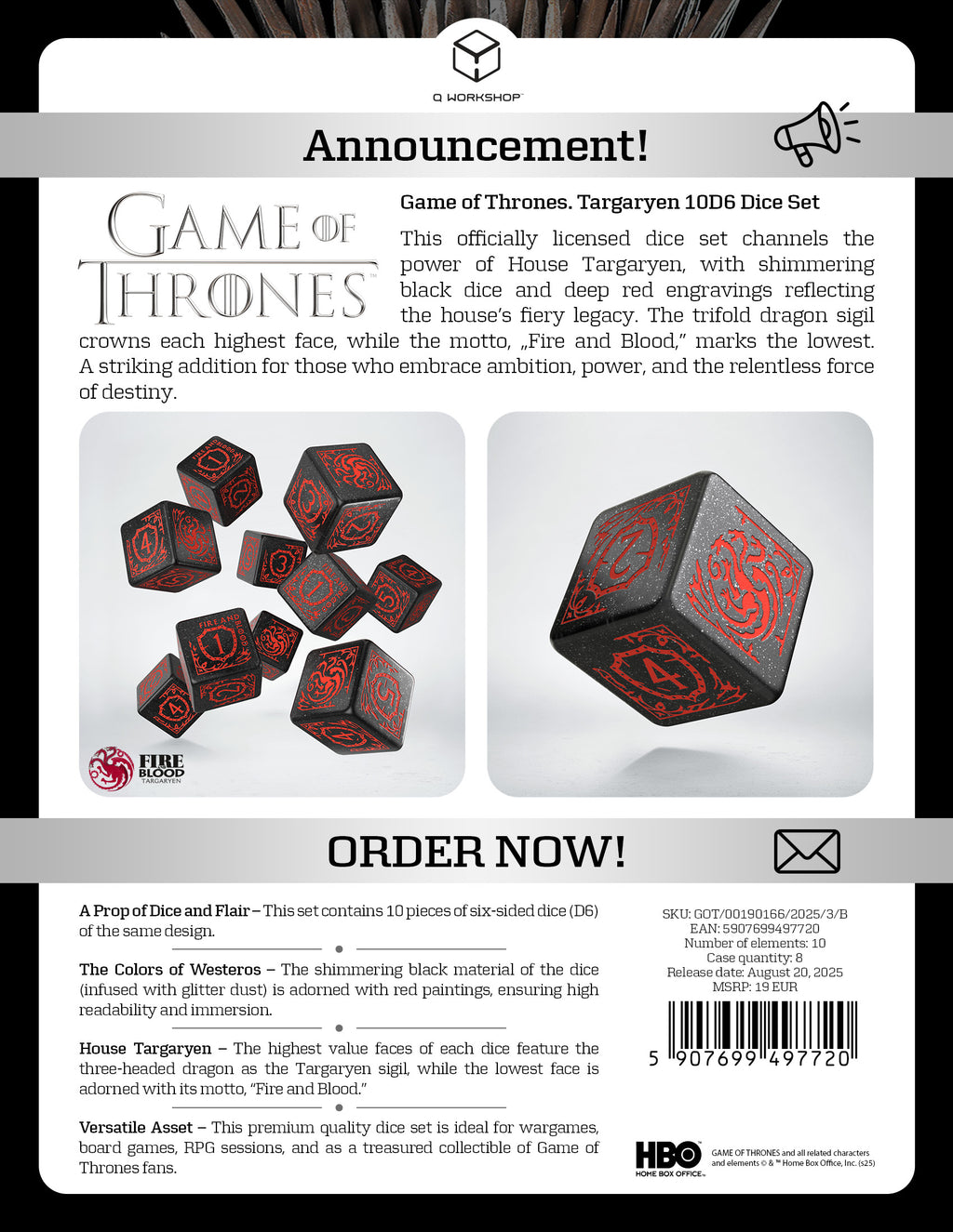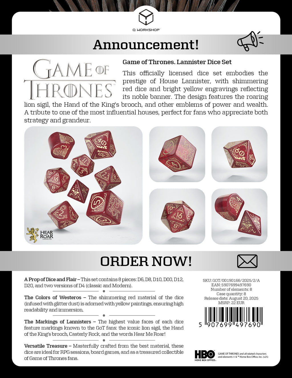 Tauche ein in die epische Welt von Westeros mit den offiziell lizenzierten Game of Thrones Würfelsets von Q WORKSHOP – für alle, die sowohl beim Spielen als auch beim Sammeln Wert auf authentische Details und hochwertige Verarbeitung legen. Jedes Set ist eine Hommage an die großen Häuser und Fraktionen der Serie, veredelt mit markanten Farben, ikonischen Symbolen und legendären Mottos.