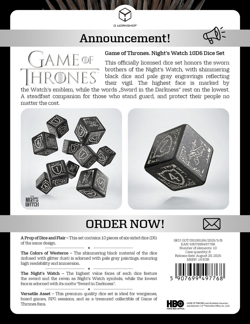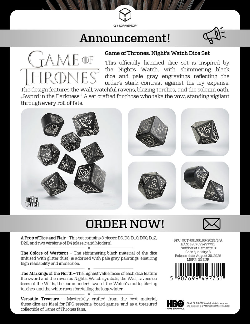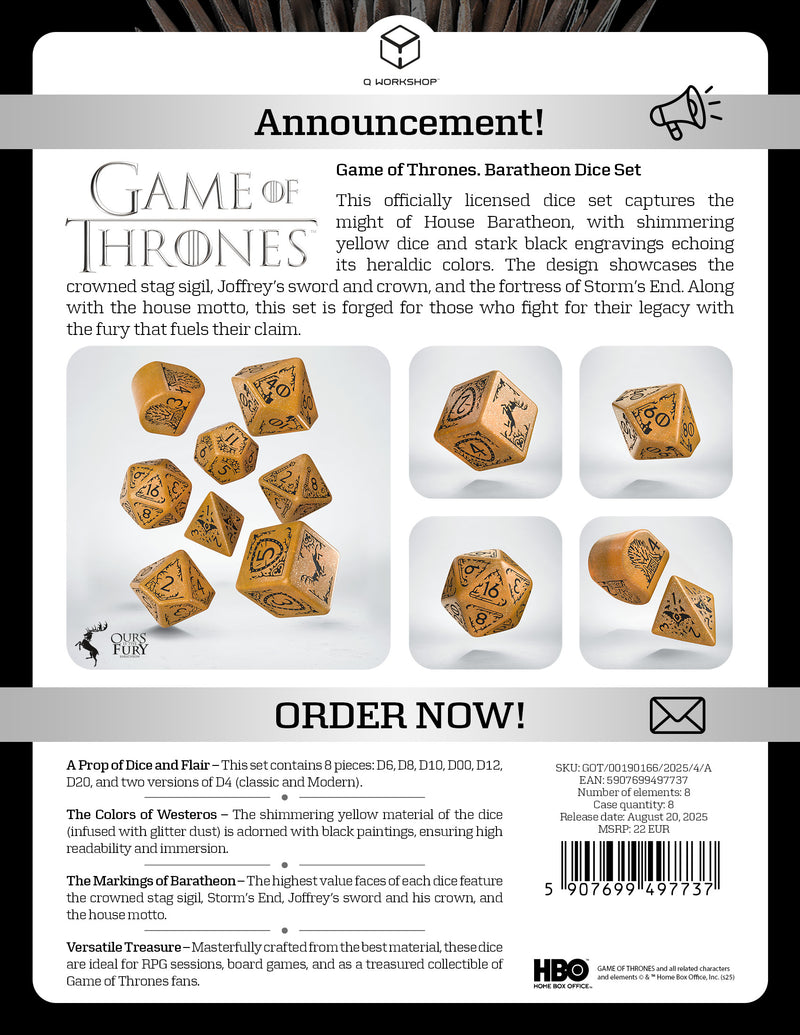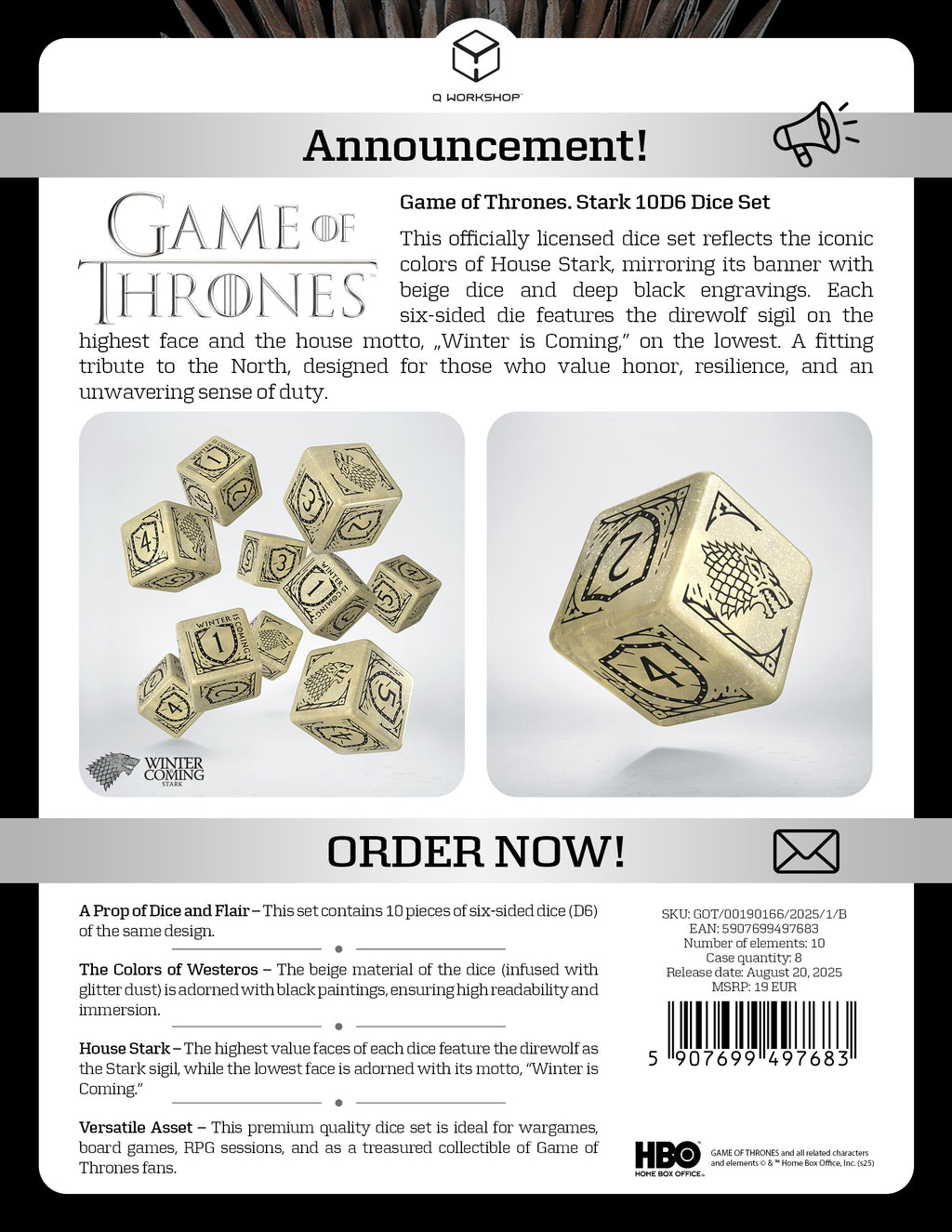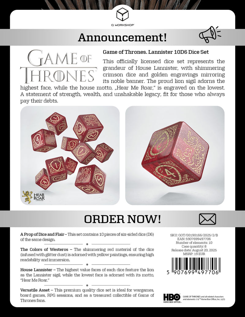 Tauche ein in die epische Welt von Westeros mit den offiziell lizenzierten Game of Thrones Würfelsets von Q WORKSHOP – für alle, die sowohl beim Spielen als auch beim Sammeln Wert auf authentische Details und hochwertige Verarbeitung legen. Jedes Set ist eine Hommage an die großen Häuser und Fraktionen der Serie, veredelt mit markanten Farben, ikonischen Symbolen und legendären Mottos.