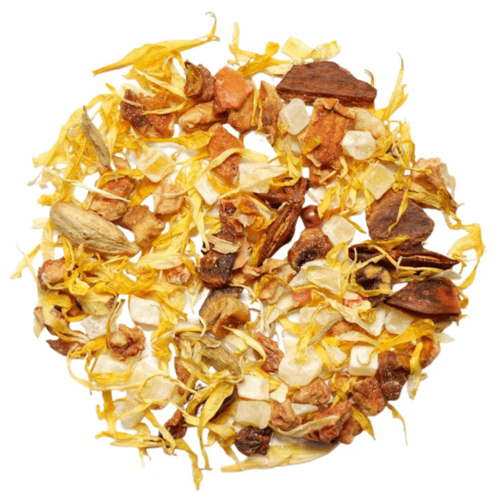 Mangostücke (Mango, Zucker, Säuerungsmittel: Zitronensäure 55 %), Apfelstücke, Kokos-Chips, Sternanis, Zimt, Kardamomfrüchte, Ringelblume, Ingwer, Süßholzwurzel, Gewürznelken, Rosa Pfeffer, natürliches Aroma