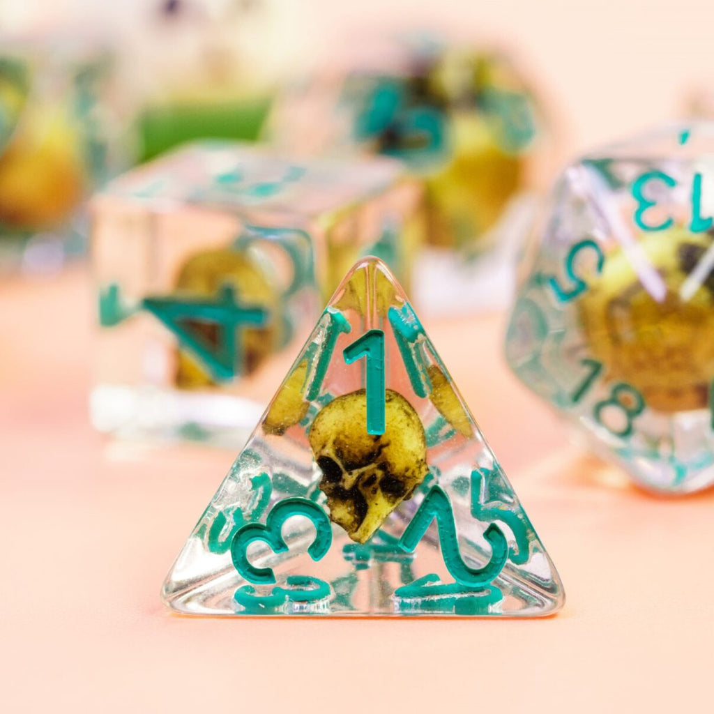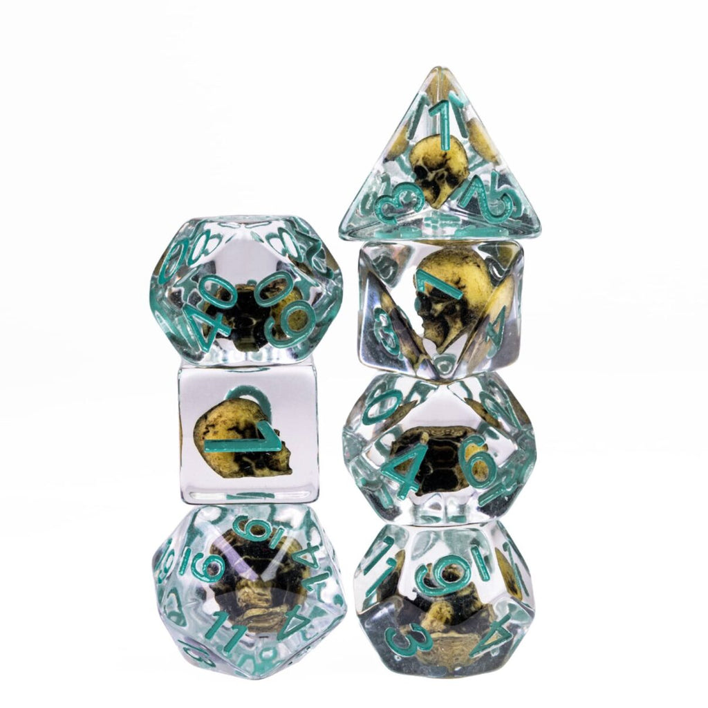 Diese Würfel sind nichts für zarte Gemüter. In den Green Skull Dice ruht der Geist vergangener Krieger – eingefangen in kristallklarem Resin, gebannt in ewiger Stille.