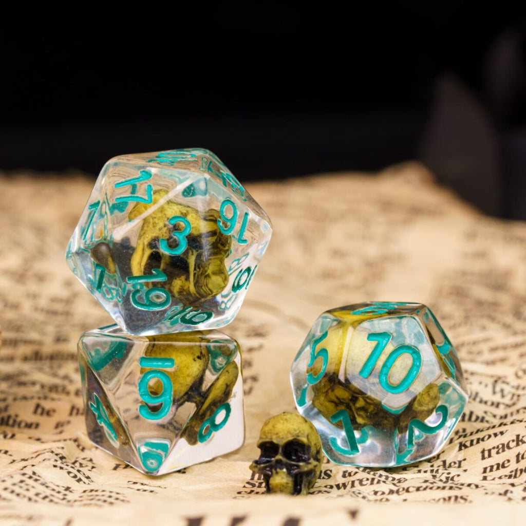 Mit ihren runden Kanten, smaragdgrünen Zahlen und dem detailreichen Totenschädel-Design sind diese Würfel ein echter Blickfang – perfekt für dunkle Kampagnen, Nekromanten, Hexenmeister oder alle, die das Spiel mit dem Tod wagen.