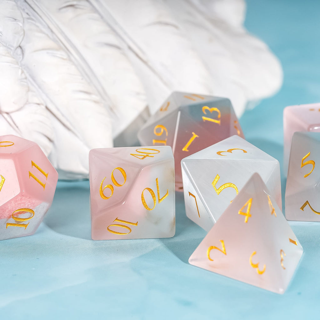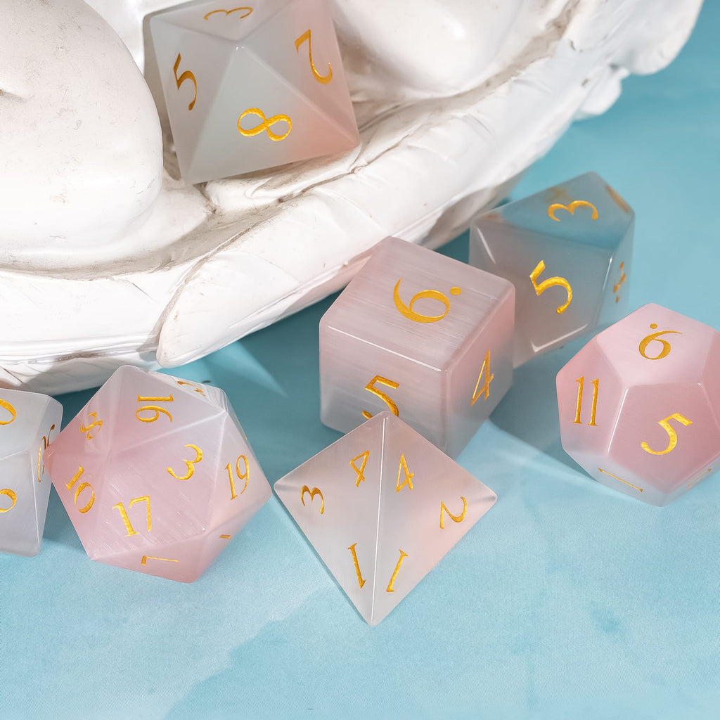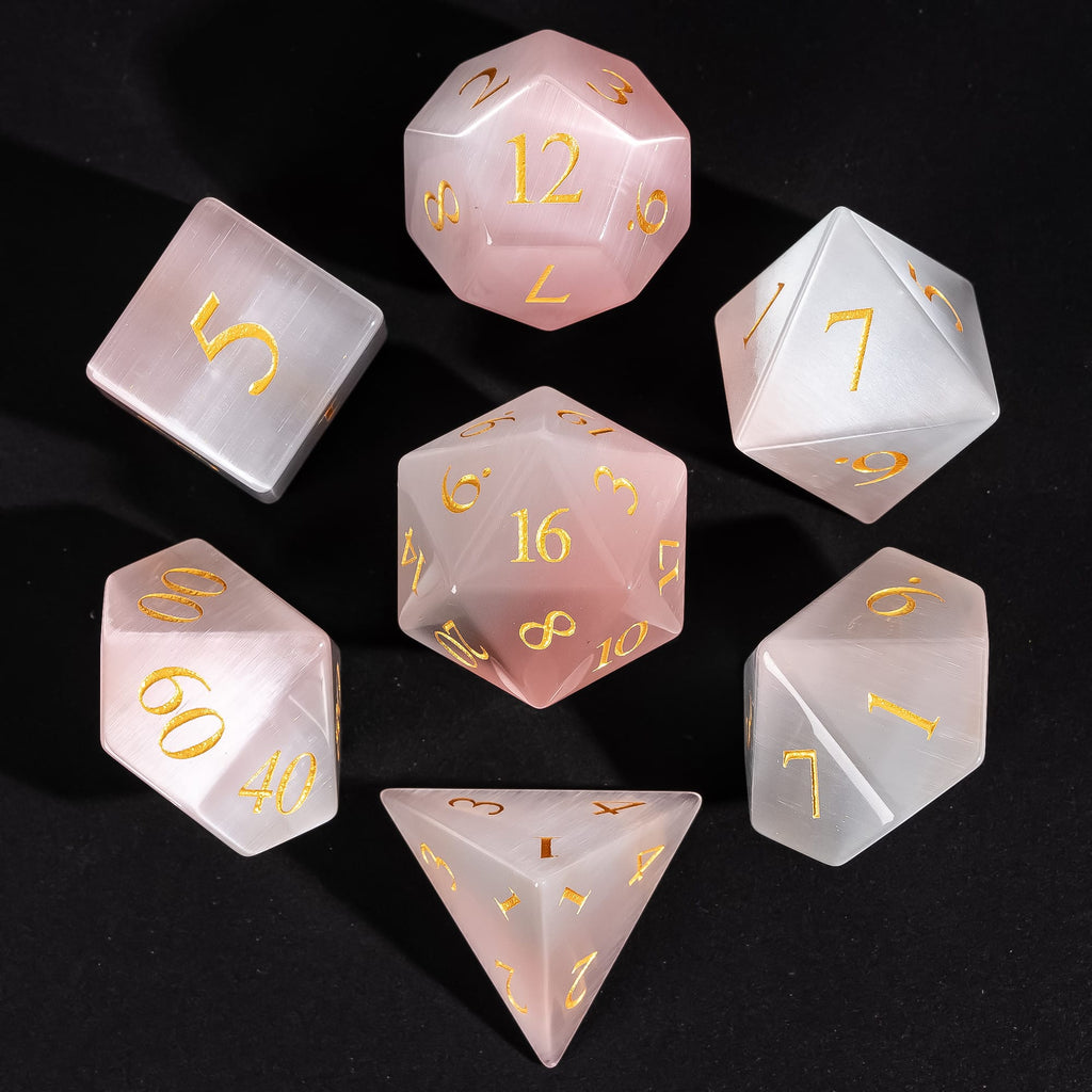 Katzenauge Rose steht für Harmonie, Achtsamkeit und innere Stärke. Es ist ein Würfelset für Träumer, Diplomaten und Hüter des Gleichgewichts – für jene, die wissen, dass wahre Macht nicht laut sein muss.