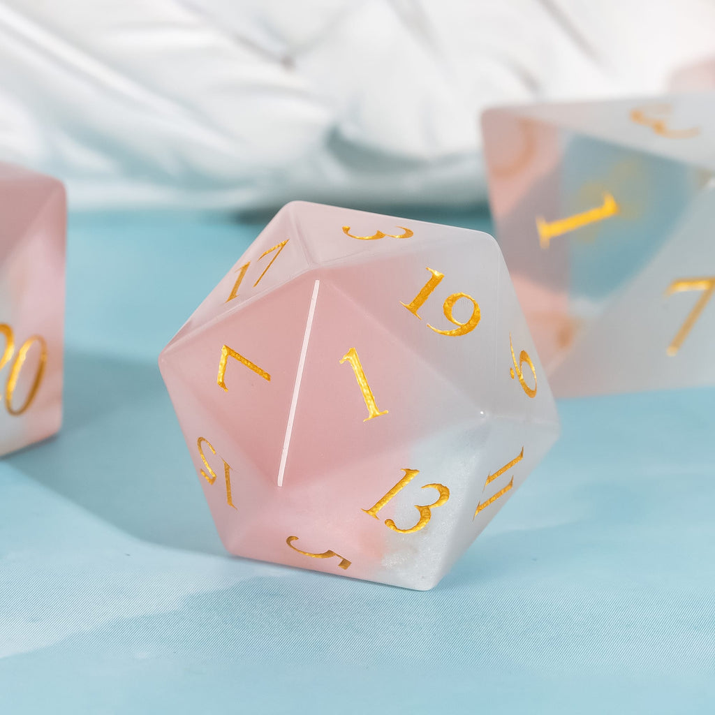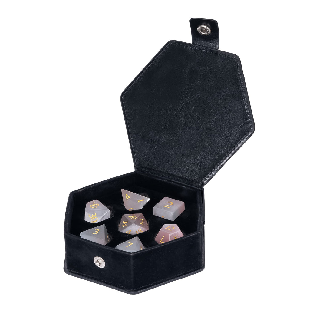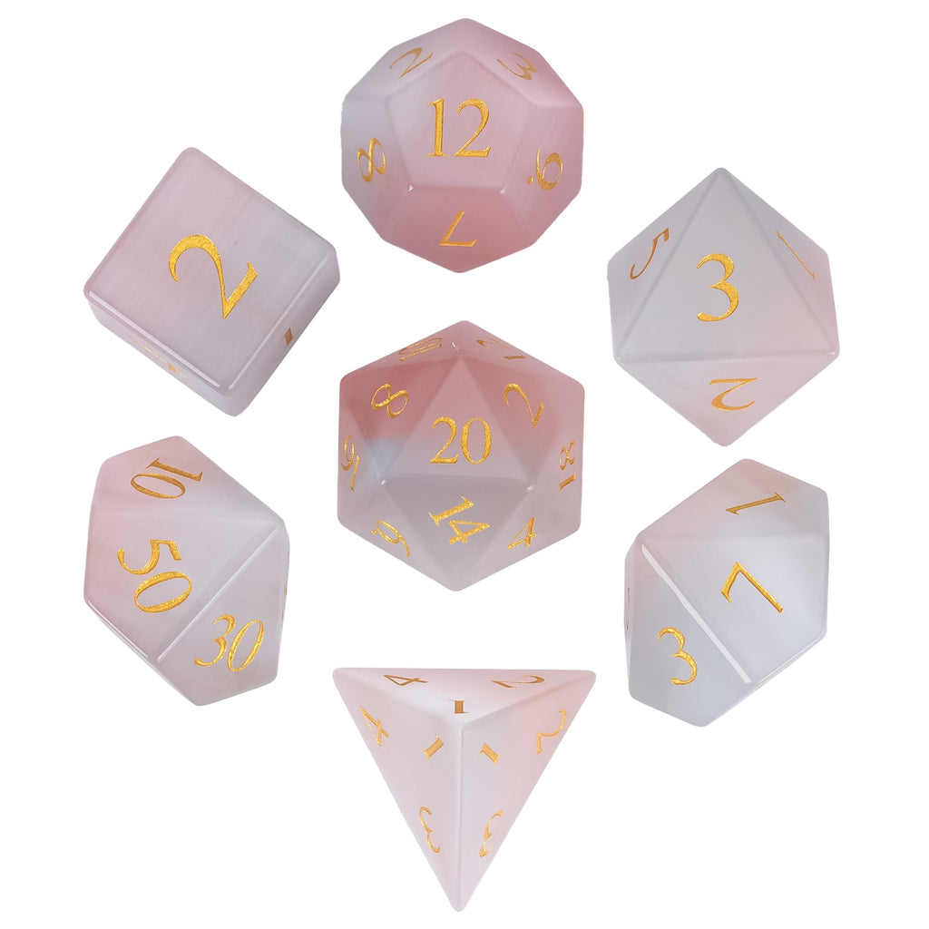 Katzenauge Rose steht für Harmonie, Achtsamkeit und innere Stärke. Es ist ein Würfelset für Träumer, Diplomaten und Hüter des Gleichgewichts – für jene, die wissen, dass wahre Macht nicht laut sein muss.