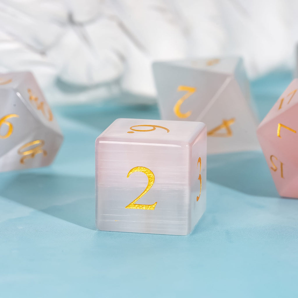 Wie der erste Lichtstrahl eines neuen Tages, der durch Nebel und Blütenblätter fällt, offenbart sich das Würfelset Katzenauge Rose. Zart, warm und von stiller Eleganz getragen, vereint es die Ruhe des Erwachens mit der zeitlosen Schönheit eines edlen Schmucksteins.