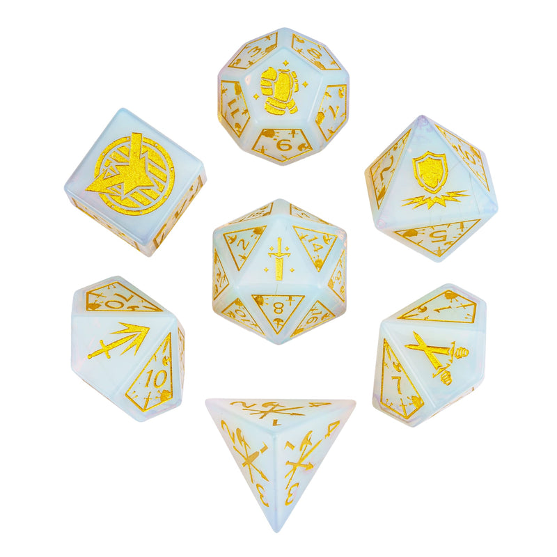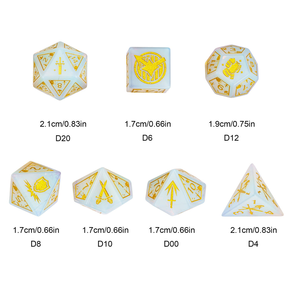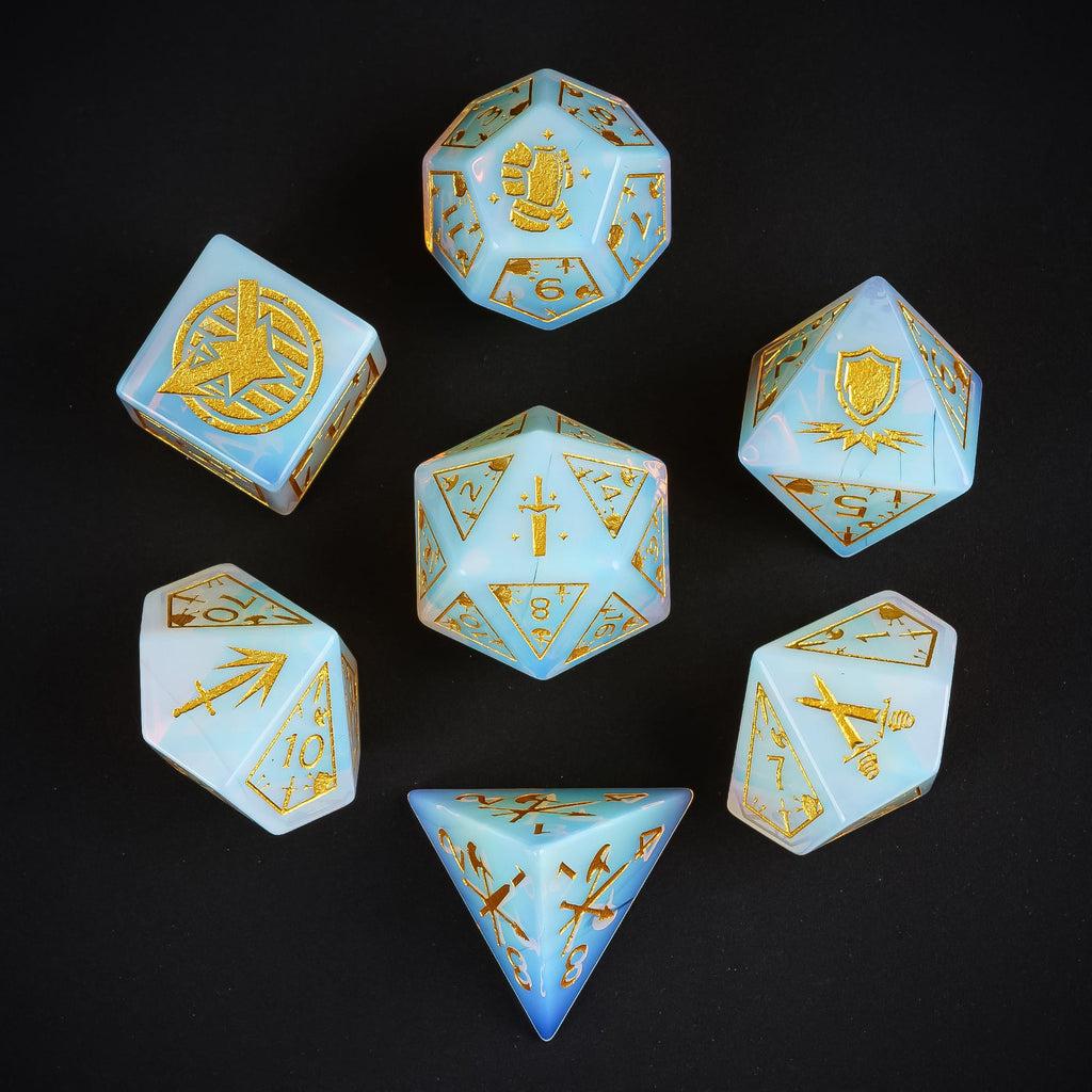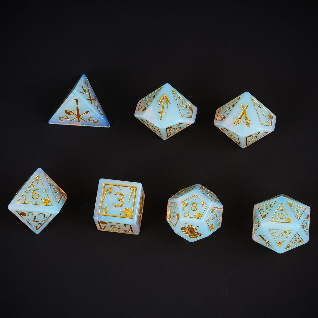 Um die erlesene Schönheit dieser Opalite-Würfel zu bewahren, empfehlen wir eine weiche Würfelunterlage – wie unsere World of Dice Würfelmatte – damit ihre magische Strahlkraft nicht verblasst.