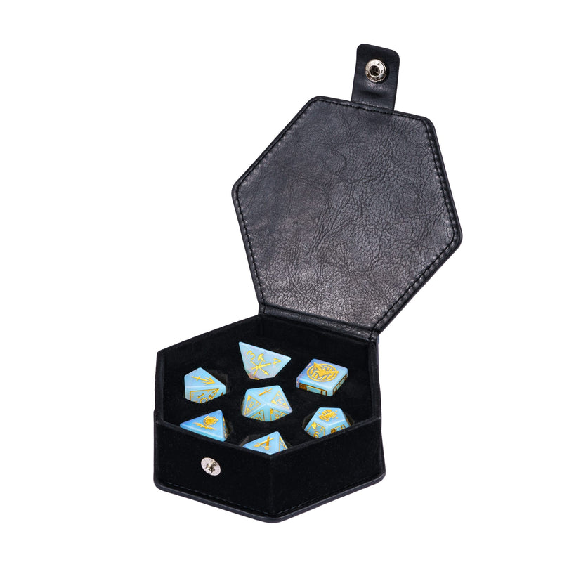 Jeder Wurf entscheidet über Leben und Tod, Sieg oder Niederlage. Um diesen Moment zu ehren, tragen die Würfel D6, D8, D10, D%, D12 und D20 kunstvolle Waffensymbole anstelle der Krit-Zahl – eine Hommage an die Klingen, Bögen und Äxte legendärer Krieger. Jeder kritische Treffer wird zu einem epischen Schlag, jede Entscheidung zu einem Hieb ins Schicksal.