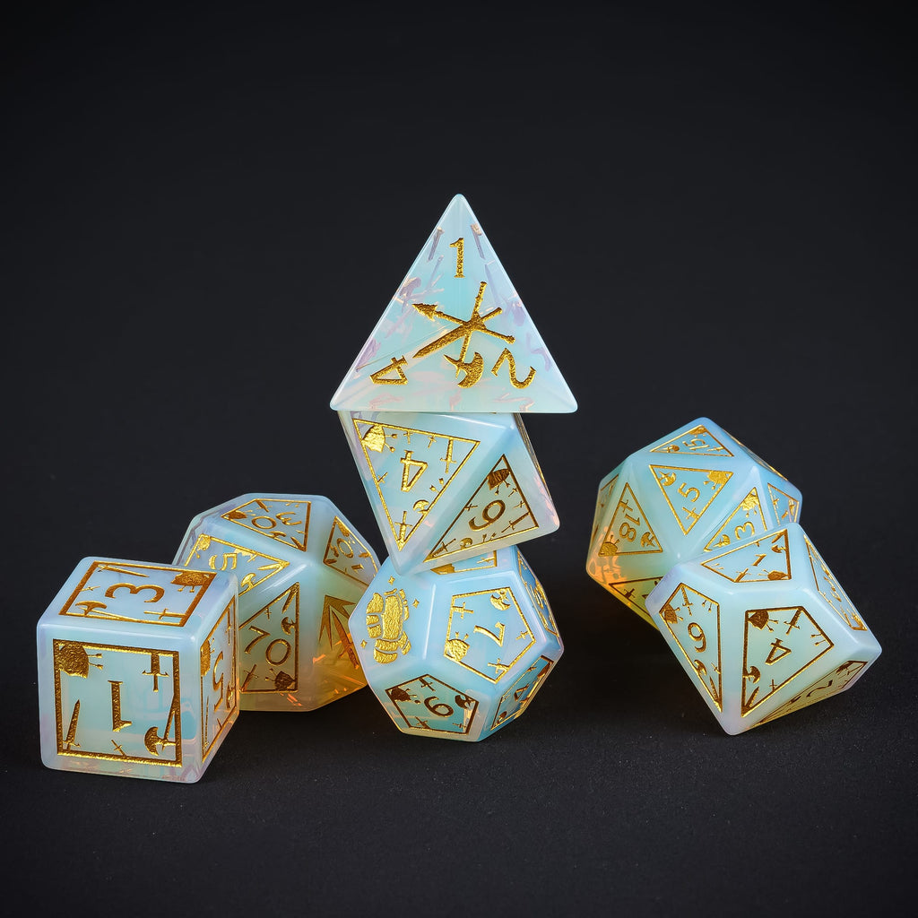 Gefertigt aus hochwertigem Opalite-Glas, besitzen diese Würfel eine halbtransparente, milchig schimmernde Optik, die je nach Lichteinfall in bläulichen und goldenen Nuancen leuchtet. Ein Artefakt von zeitloser Eleganz – so als wäre es direkt aus einer magischen Schmiede entsprungen.
