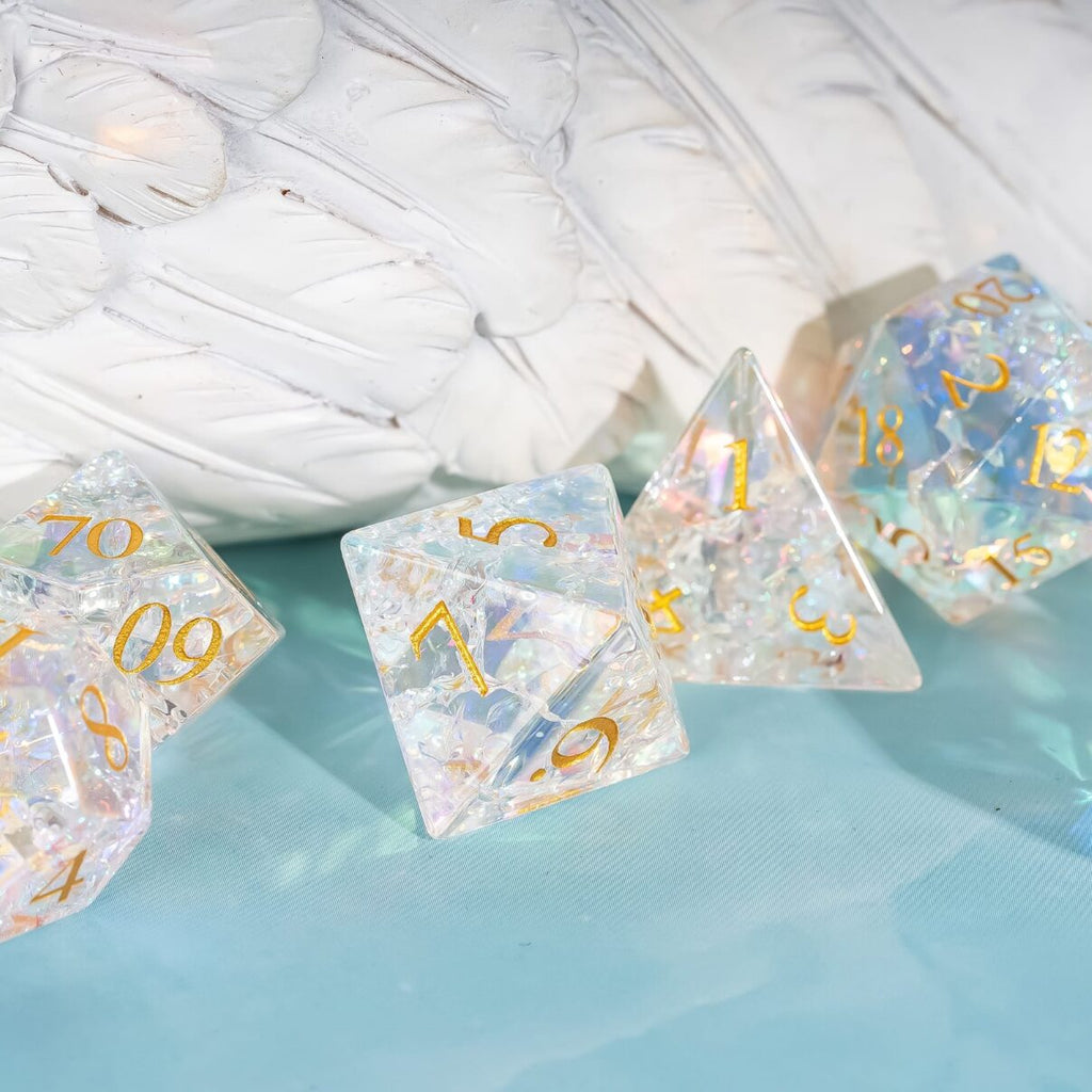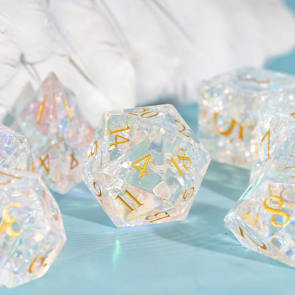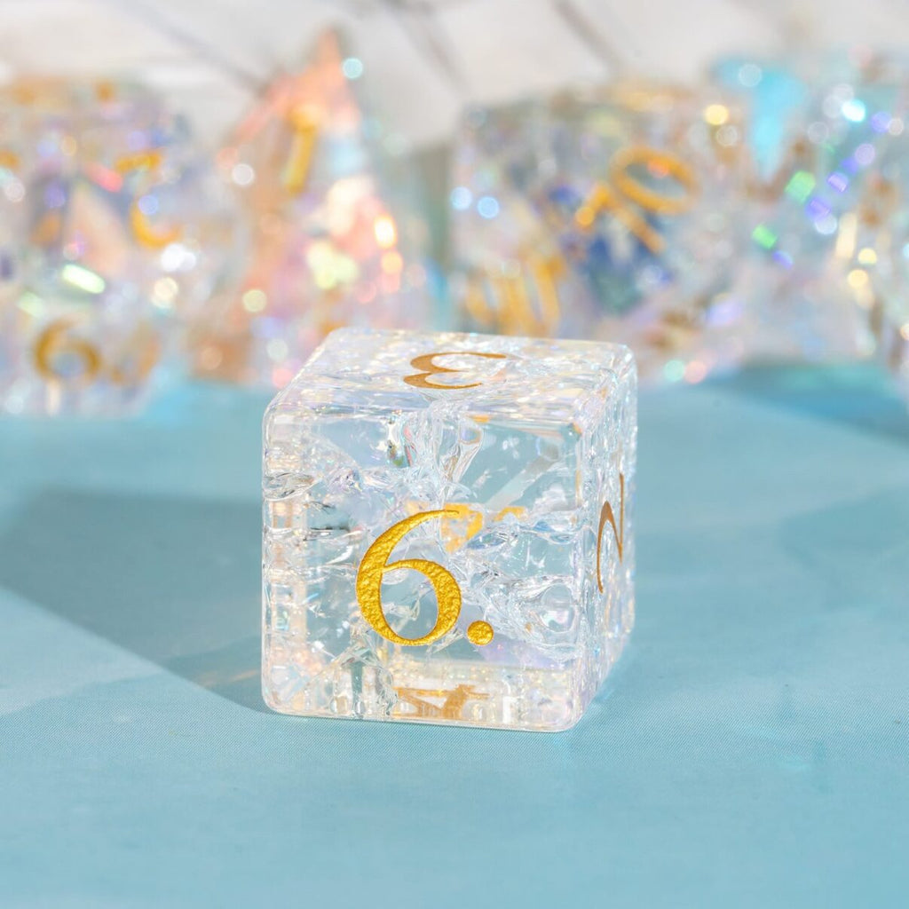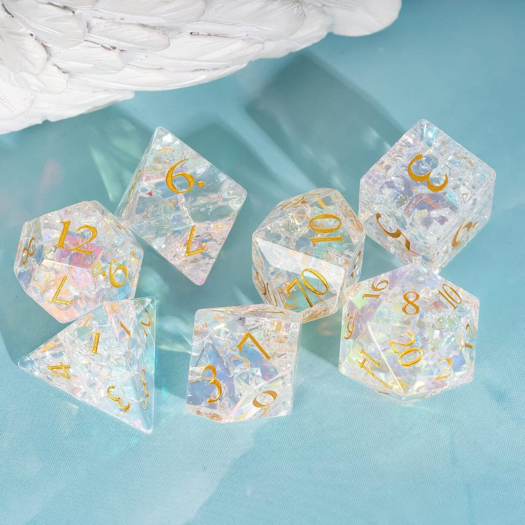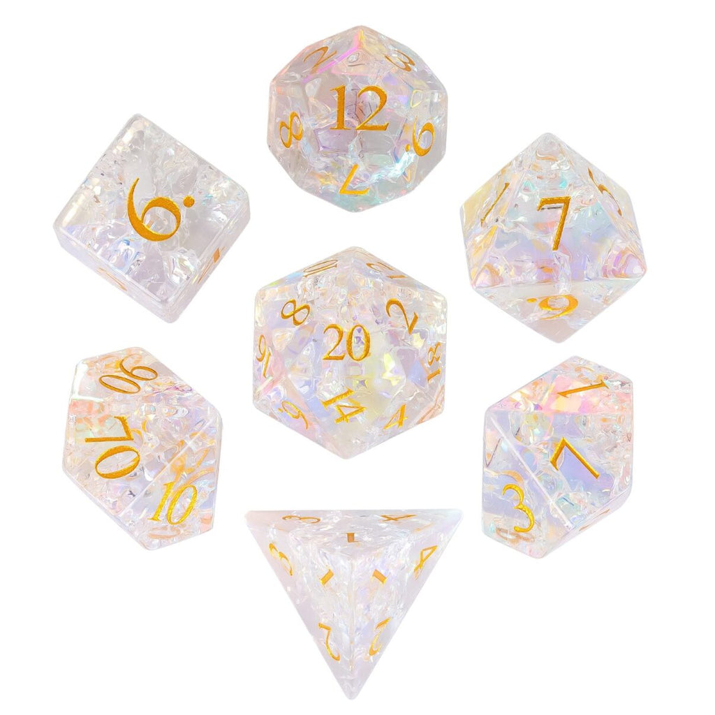Set aus 7 Glaswürfeln: D4, D6, D8, D10, D10.0, D12, D20
