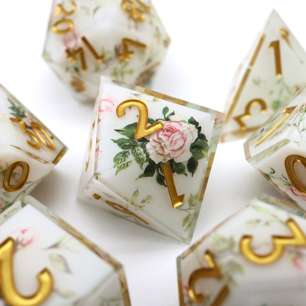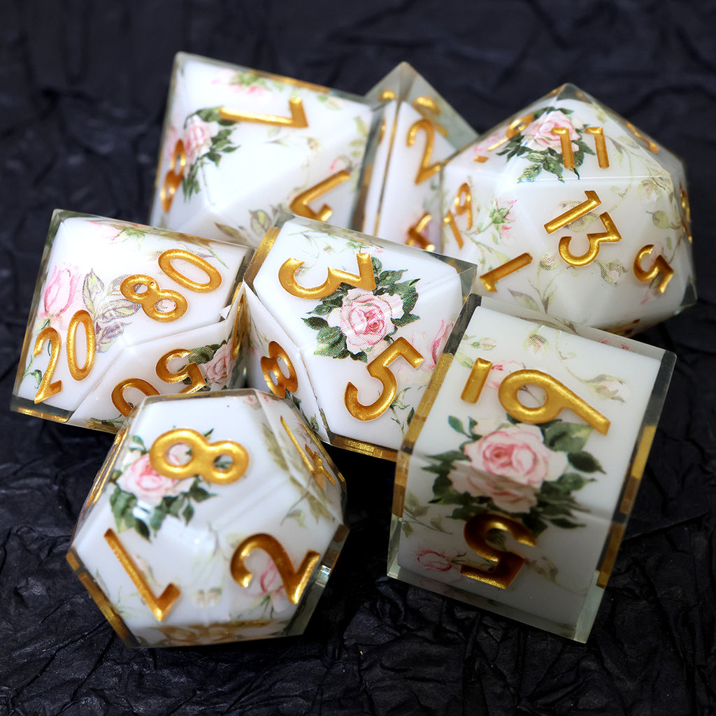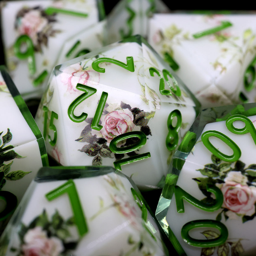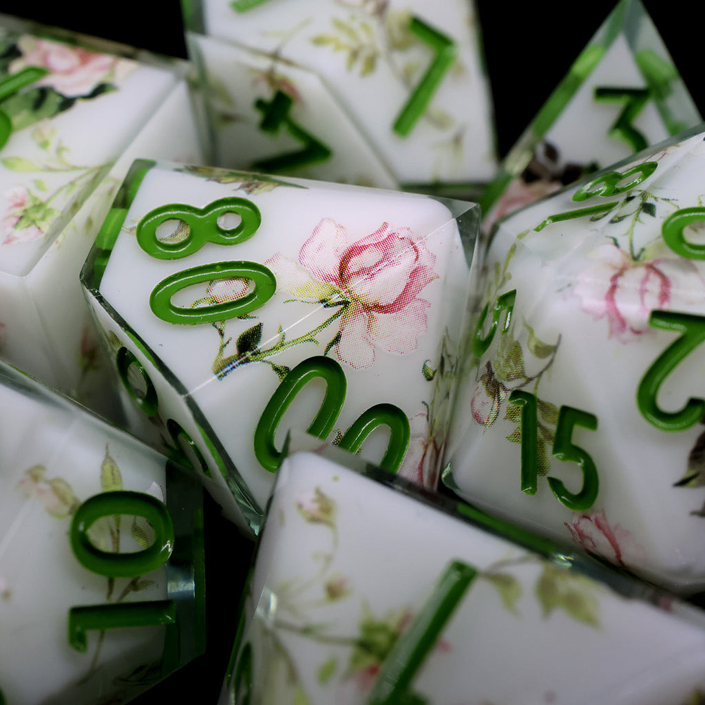 Die Sylvan Rose Würfel wirken, als wären sie direkt aus einem verwunschenen Waldhain gefertigt. Zarte Rosenapplikationen entfalten sich über einem sanften, weißen Hintergrund, während grüne Zahlen wie frische Blätter zwischen den Blüten hervortreten. Die klaren Kanten der Sharp-Edge-Würfel verleihen dem Set eine elegante Form, während die floralen Details eine ruhige, natürliche Schönheit ausstrahlen.