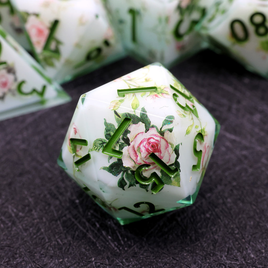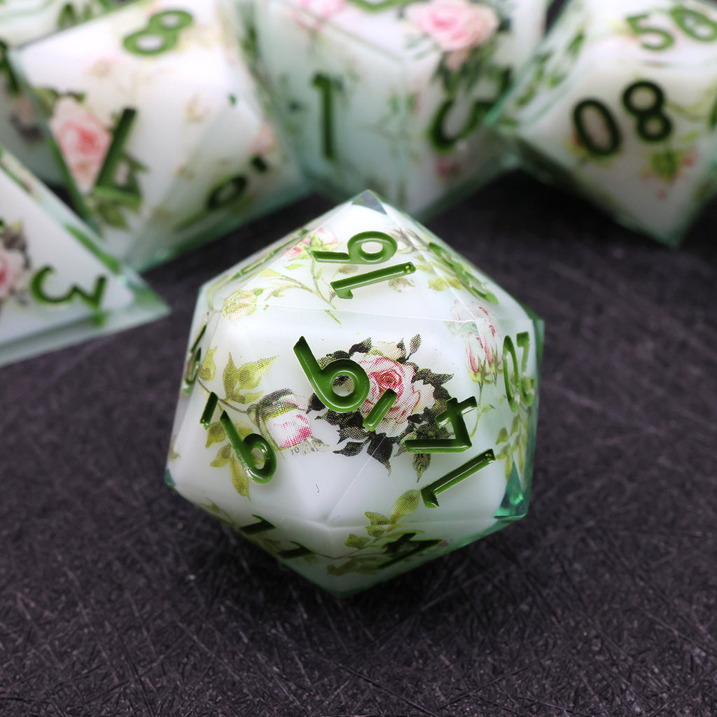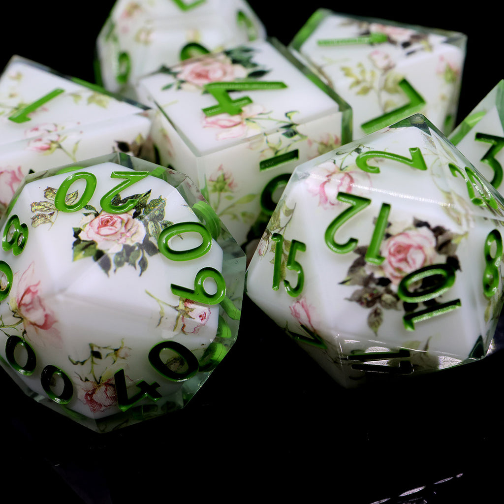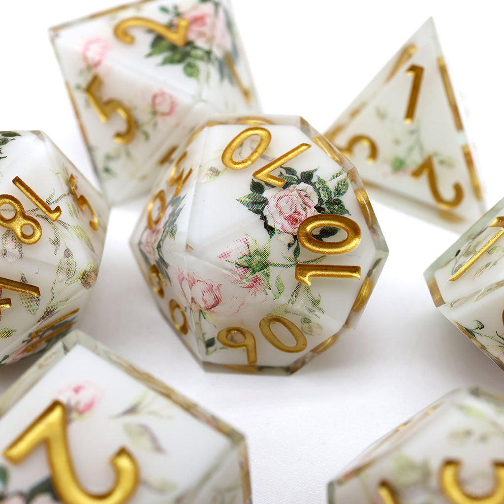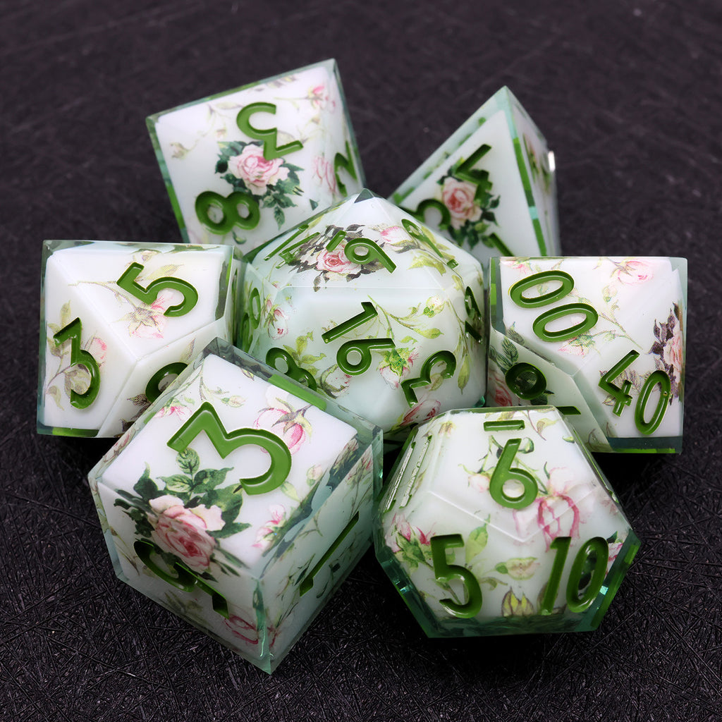 Die Sylvan Rose Würfel wirken, als wären sie direkt aus einem verwunschenen Waldhain gefertigt. Zarte Rosenapplikationen entfalten sich über einem sanften, weißen Hintergrund, während grüne Zahlen wie frische Blätter zwischen den Blüten hervortreten. Die klaren Kanten der Sharp-Edge-Würfel verleihen dem Set eine elegante Form, während die floralen Details eine ruhige, natürliche Schönheit ausstrahlen.