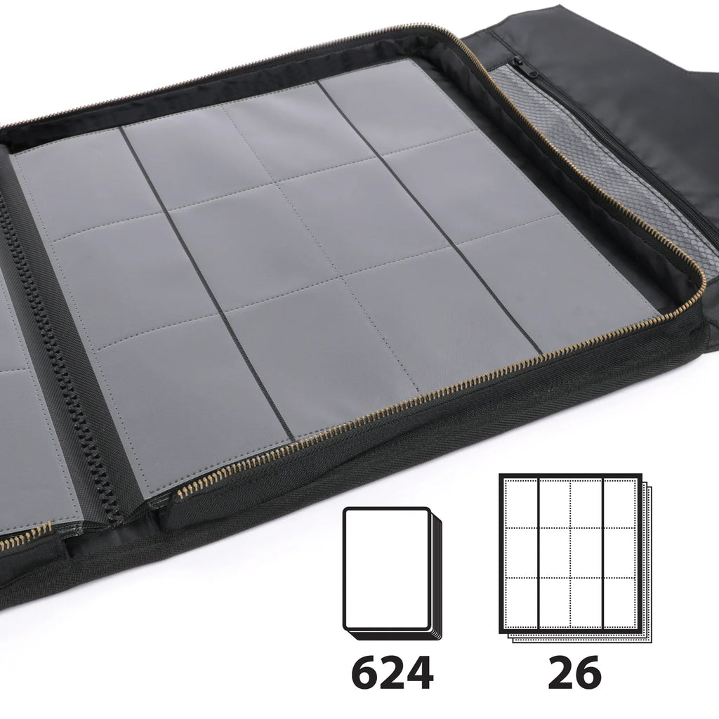Dieses hochwertige Trading Card Album bietet Platz für bis zu 624 Sammelkarten und ist die ideale Lösung für Sammler und Spieler, die ihre Karten ordentlich organisieren und optimal schützen möchten. Mit 26 doppelseitigen Seiten und jeweils 12 Kartenfächern pro Seite hast du jederzeit schnellen Überblick über deine Sammlung.
