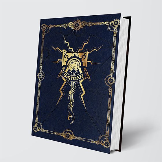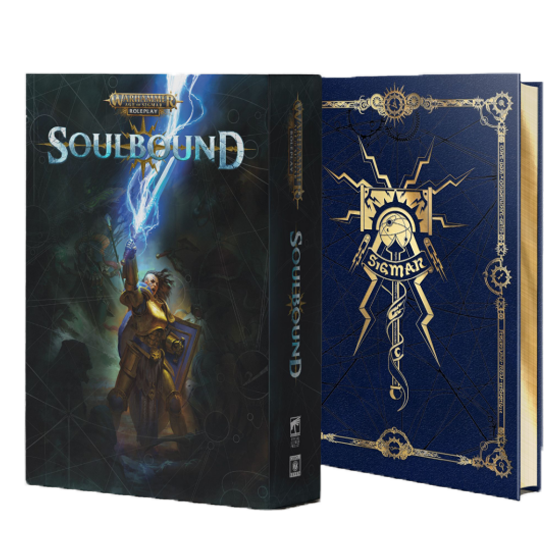 Diese luxuriöse Collector’s Edition des Warhammer Age of Sigmar: Soulbound Rollenspiels ist ein echtes Highlight für Sammler und Fans. Das Buch kommt mit einem edlen blauen Kunstledereinband, verziert mit einem Stormcast Eternal Kriegshammer und den Symbolen der Reiche der Sterblichen in goldener Prägung. Die goldgeschnittenen Seiten verleihen ihm ein besonders hochwertiges Finish.
