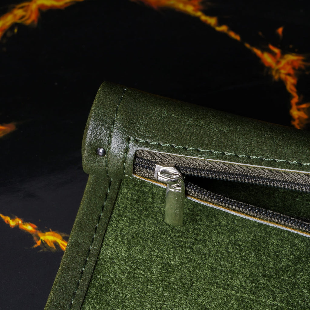 Gefertigt aus hochwertigem Kunstleder in sattem Waldgrün, erinnert sie an moosbedeckte Pfade und alte Runensteine. Der weiche Velour-Filz im Inneren schützt deine Würfel vor harten Aufprallen und sorgt für ein leises, kontrolliertes Rollen, ideal für intensive Spielszenen, bei denen jeder Wurf zählt.